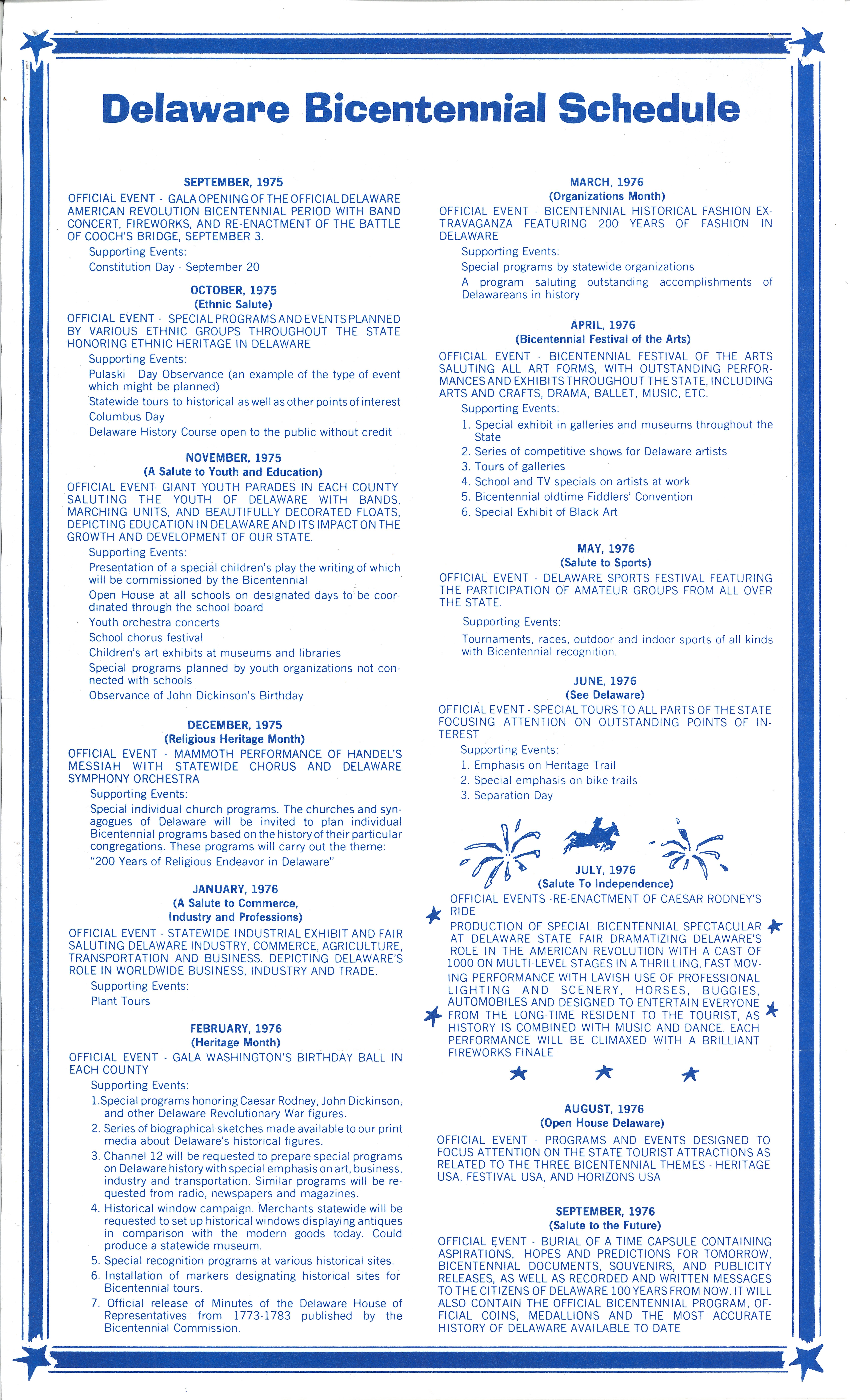 This top-level schedule of Bicentennial-related events in Delaware from September 1975 to September 1976 was published by the Delaware American Revolution Bicentennial Commission. Each state developed similar schedules and communities were encouraged to plan events in which people could participate actively, rather than just as spectators.