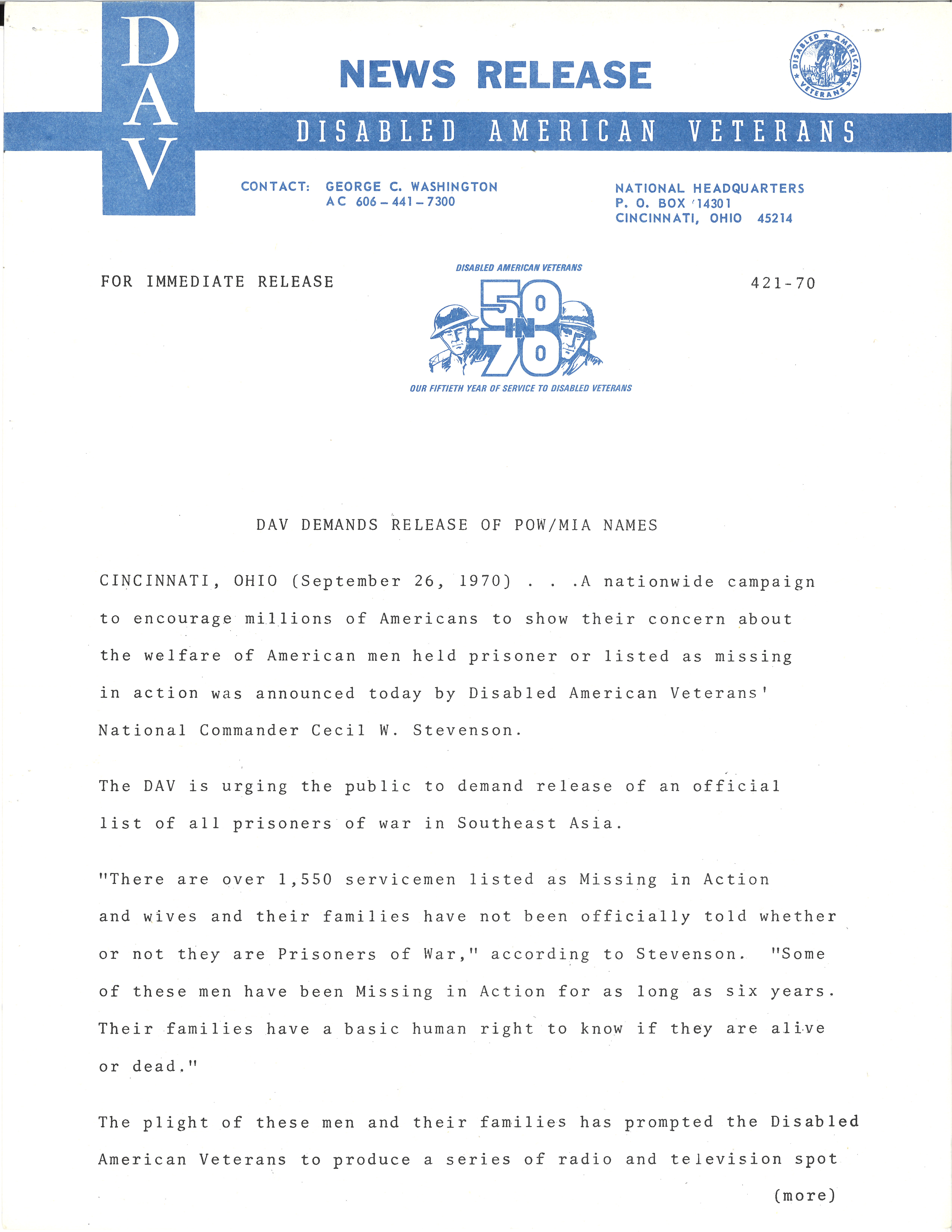 Disabled American Veterans News Release, September 26, 1970