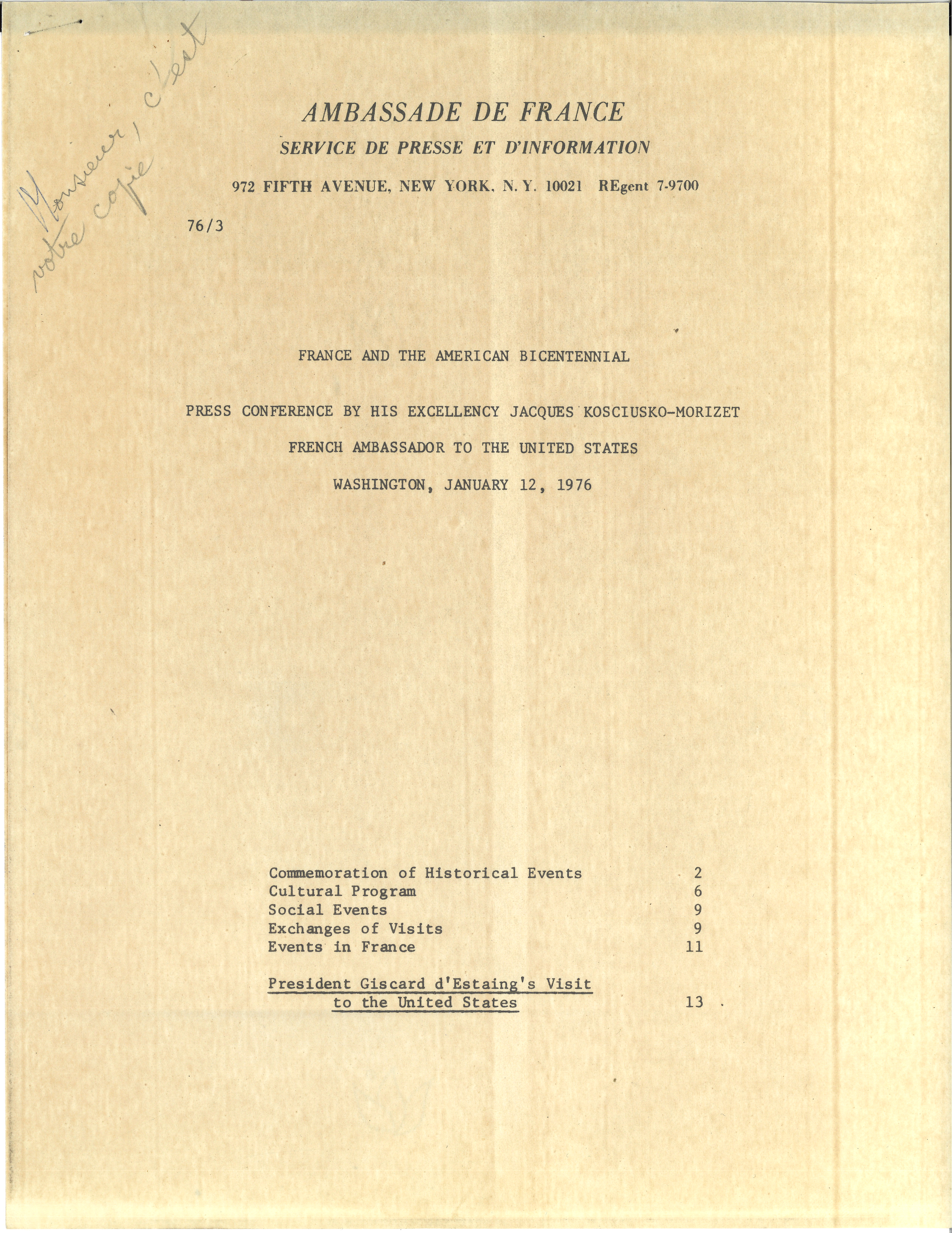 Documents from the Press Conference with the French Ambassador to the U.S., January 12, 1976