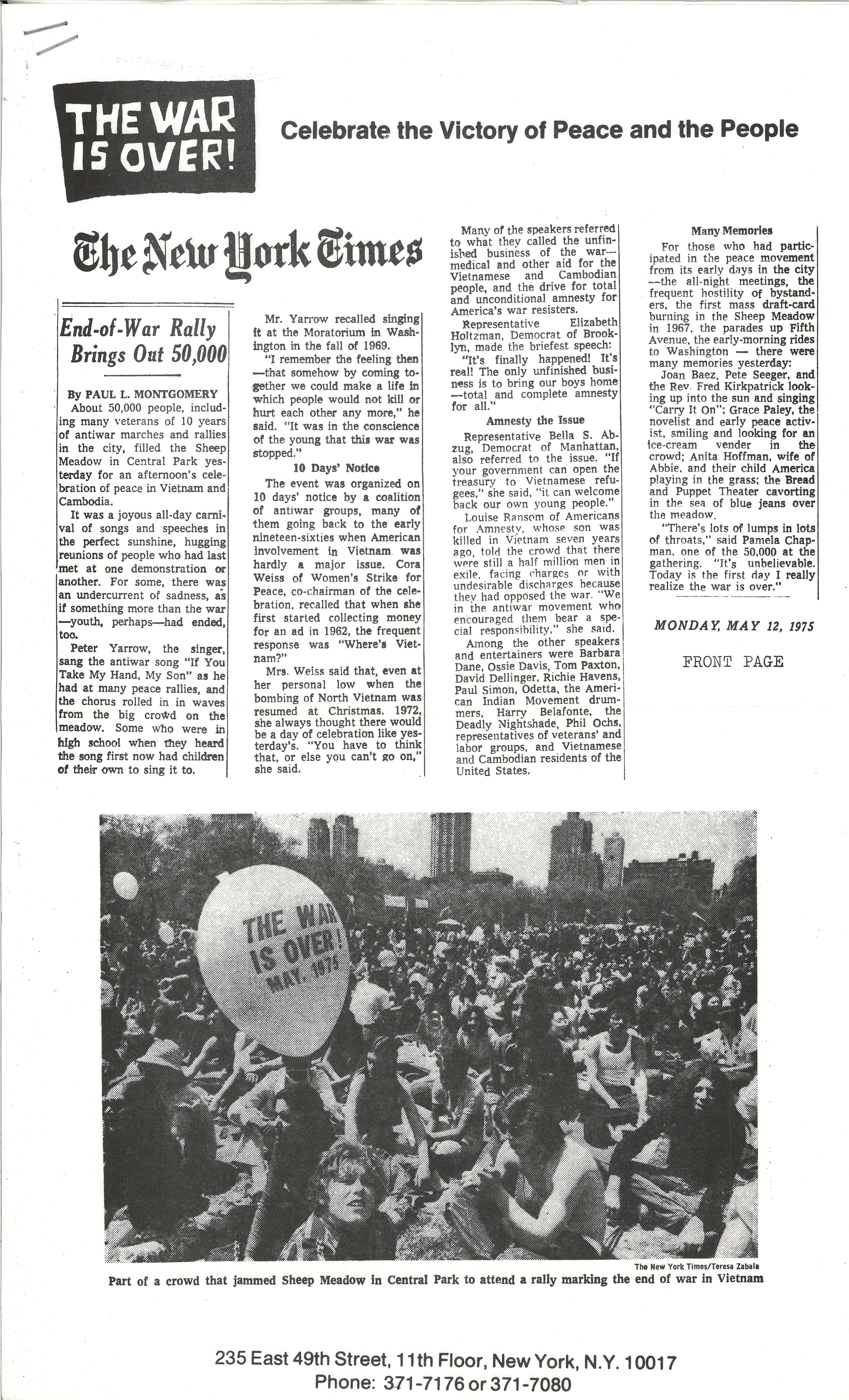 "End-of-War Rally Brings Out 50,000" by Paul L. Montgomery, The New York Times, May 12, 1975