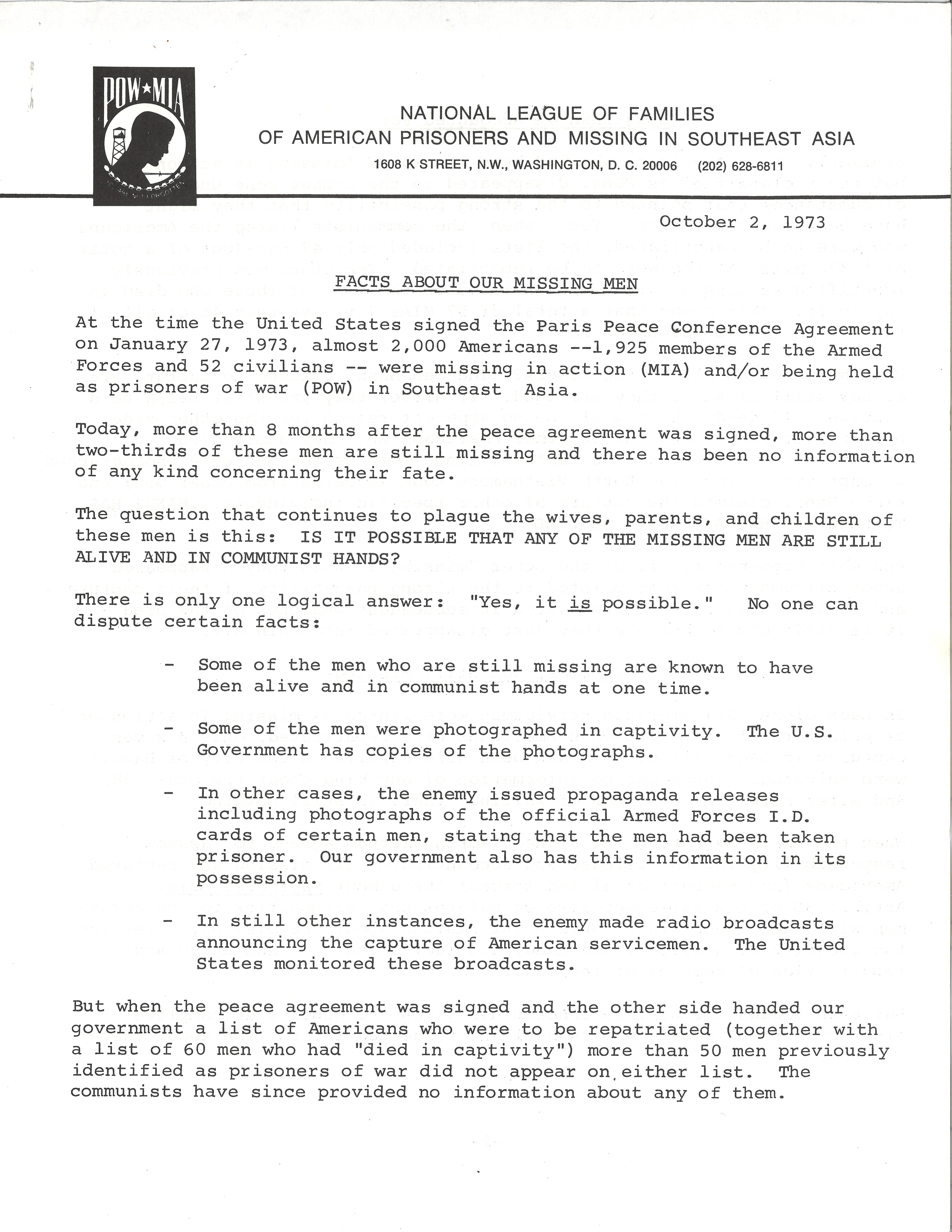 This press release from the National League of Families of American Prisoners and Missing in Southeast Asia notes that despite the signing of the Paris Peace Conference Agreement at the beginning of 1973, nearly 2,000 Americans remain missing or are still being held as POWs in Southeast Asia. The group demands answers from the North Vietnamese and their allies and asks for the support of the American government in getting those answers.