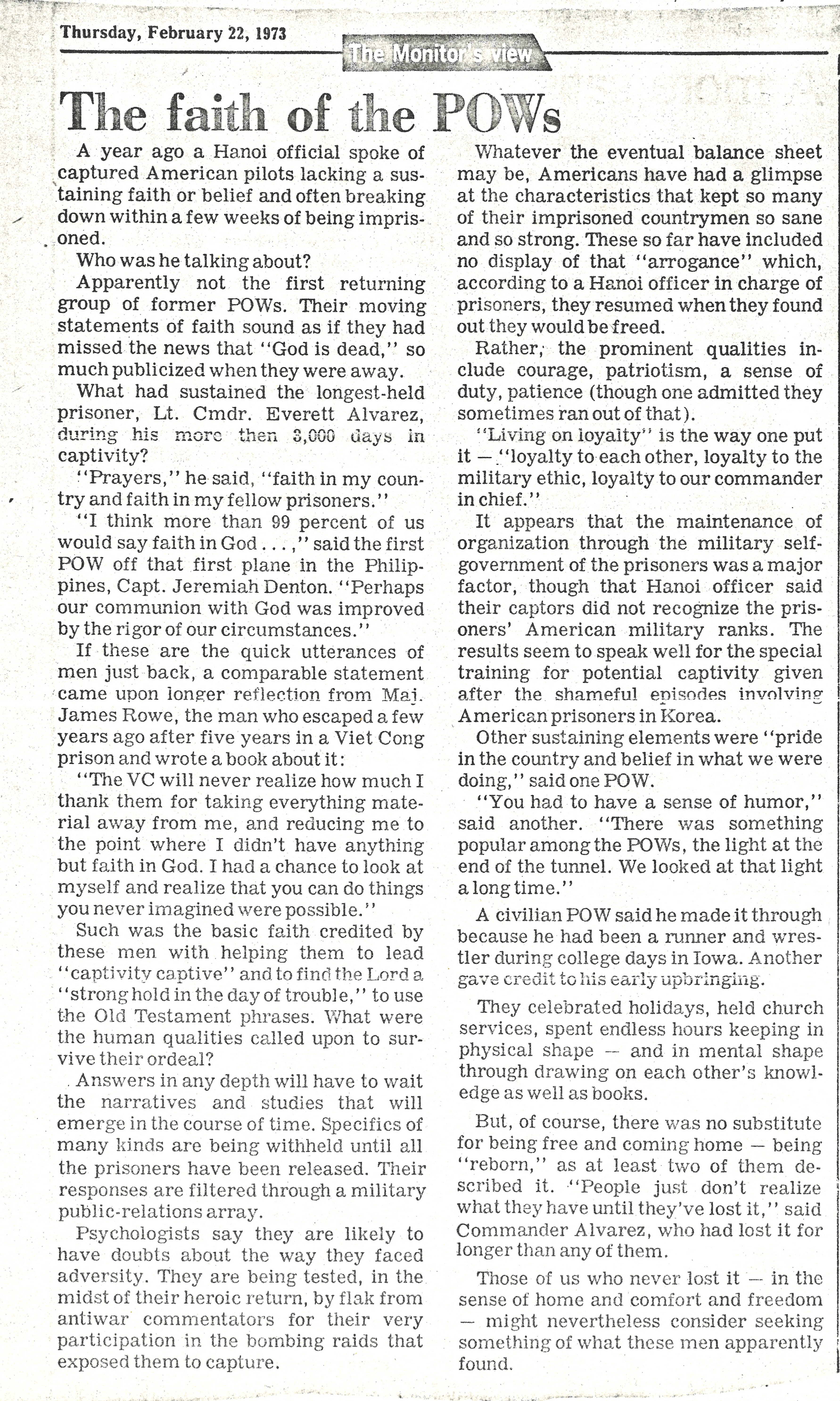 "The Faith of the POWs", February 22, 1973