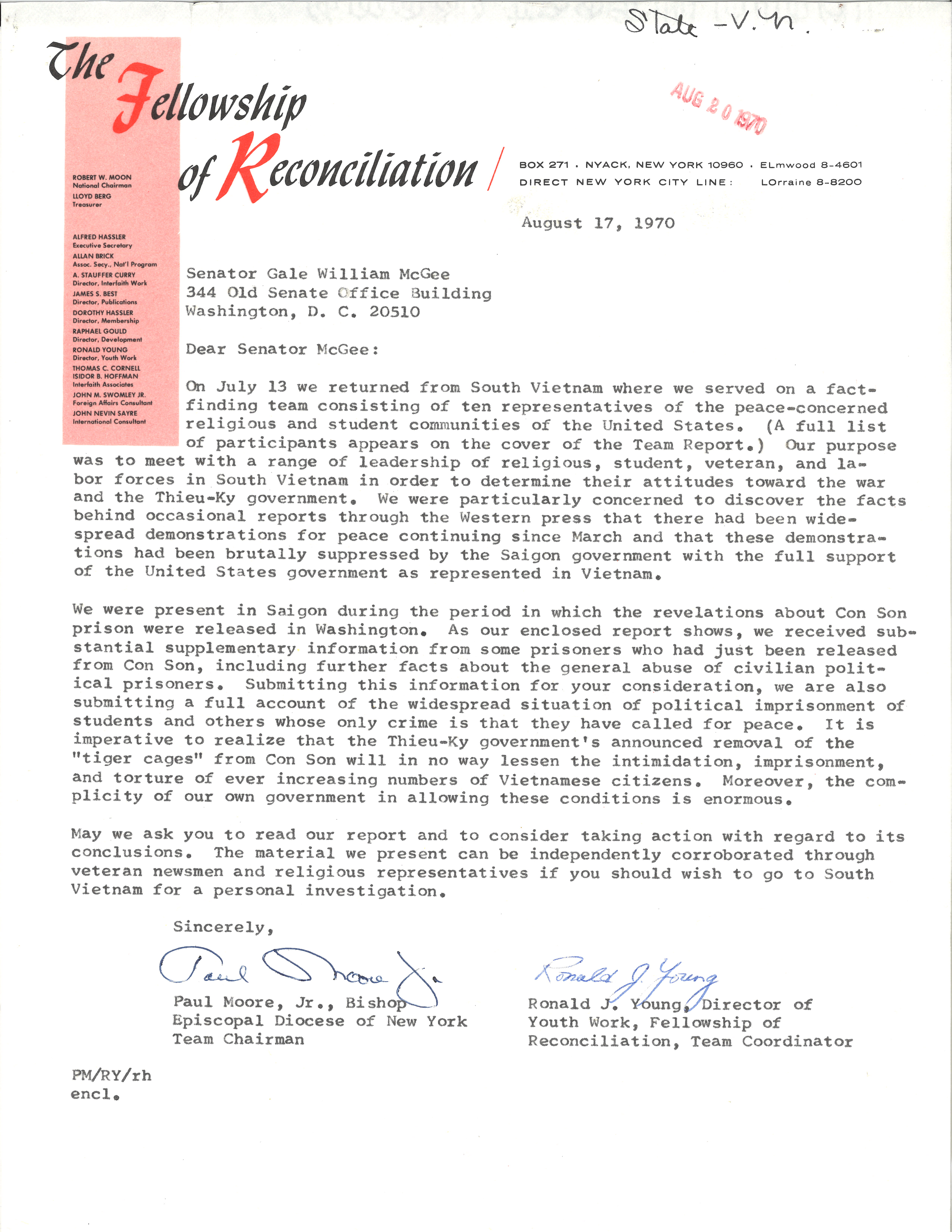 This letter and the attached report was prepared by a group of peace-concerned religious and student communities in the U.S. after the group made a fact-finding trip to South Vietnam. They discovered that the South Vietnamese government was brutally suppressing demonstrations for peace by citizens of South Vietnam.