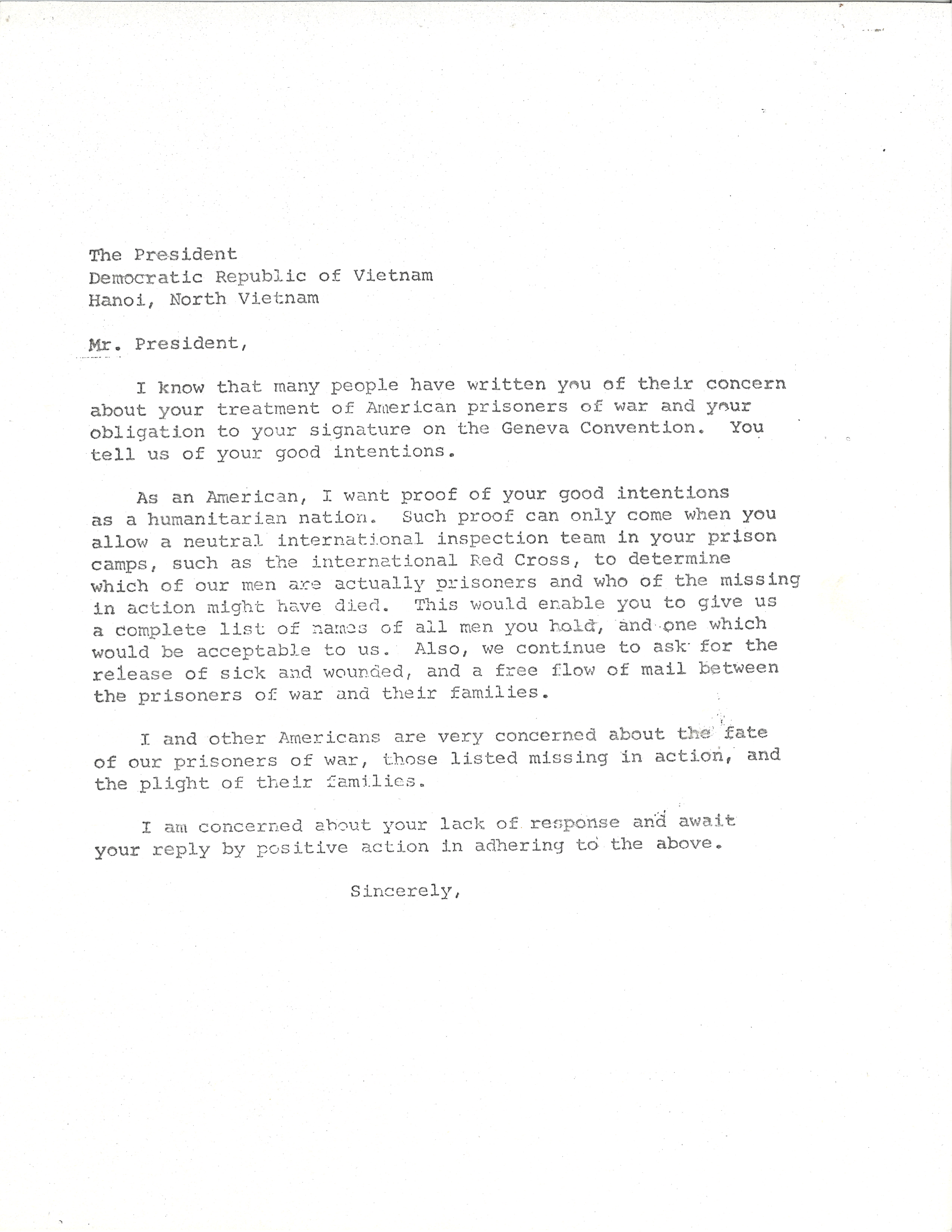 This form letter was distributed to Americans, who were urged to write the leader of North Vietnam. The letter urged compliance with the Geneva Convention and cooperation with the International Red Cross.