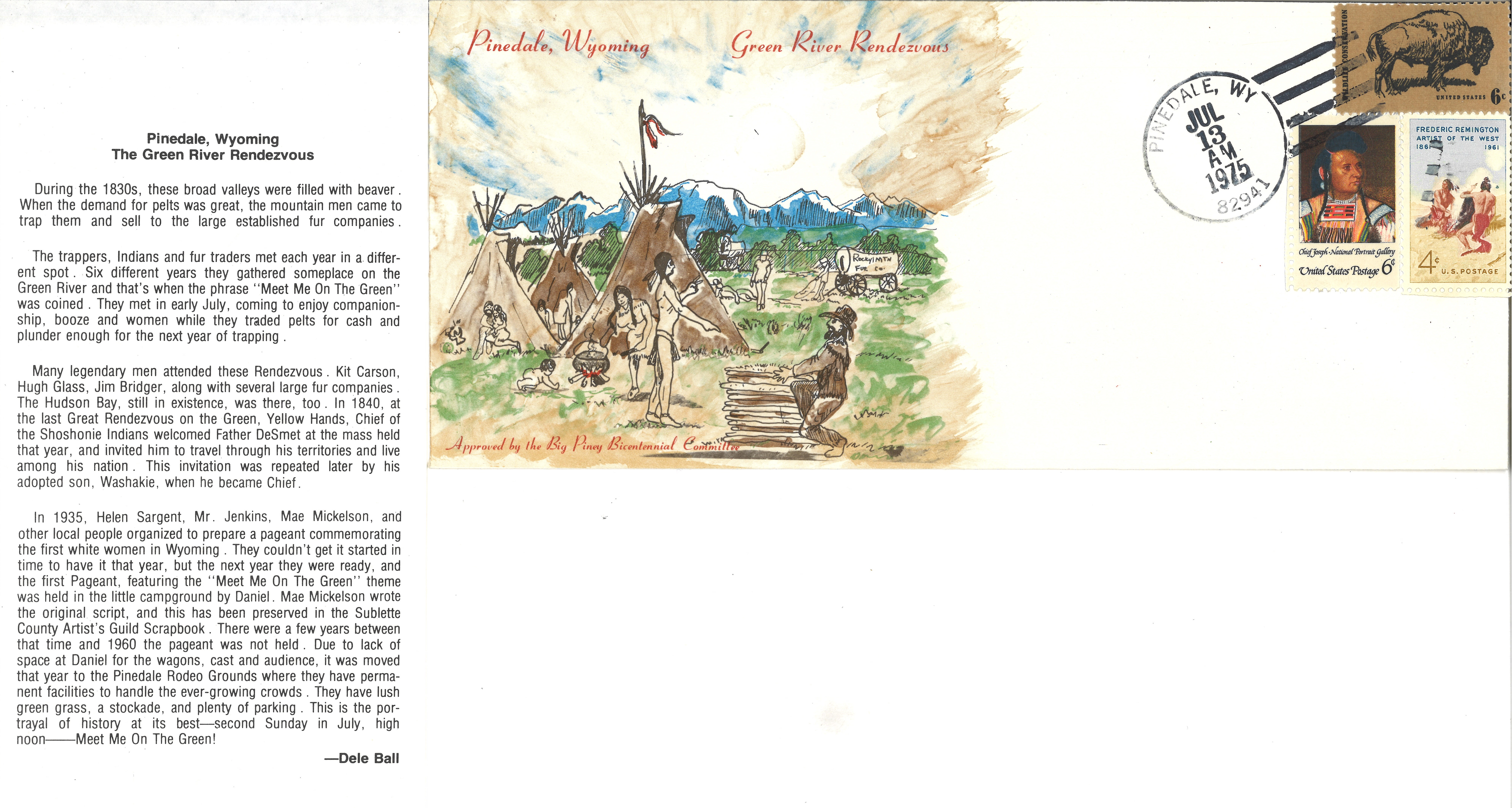 One of the Big Piney Bicentennial Committee's projects was the issuance of specially designed Bicentennial envelopes. This envelope, with artwork by Dele Ball, commemorates the Green River Rendezvous of the 1830s in Wyoming.