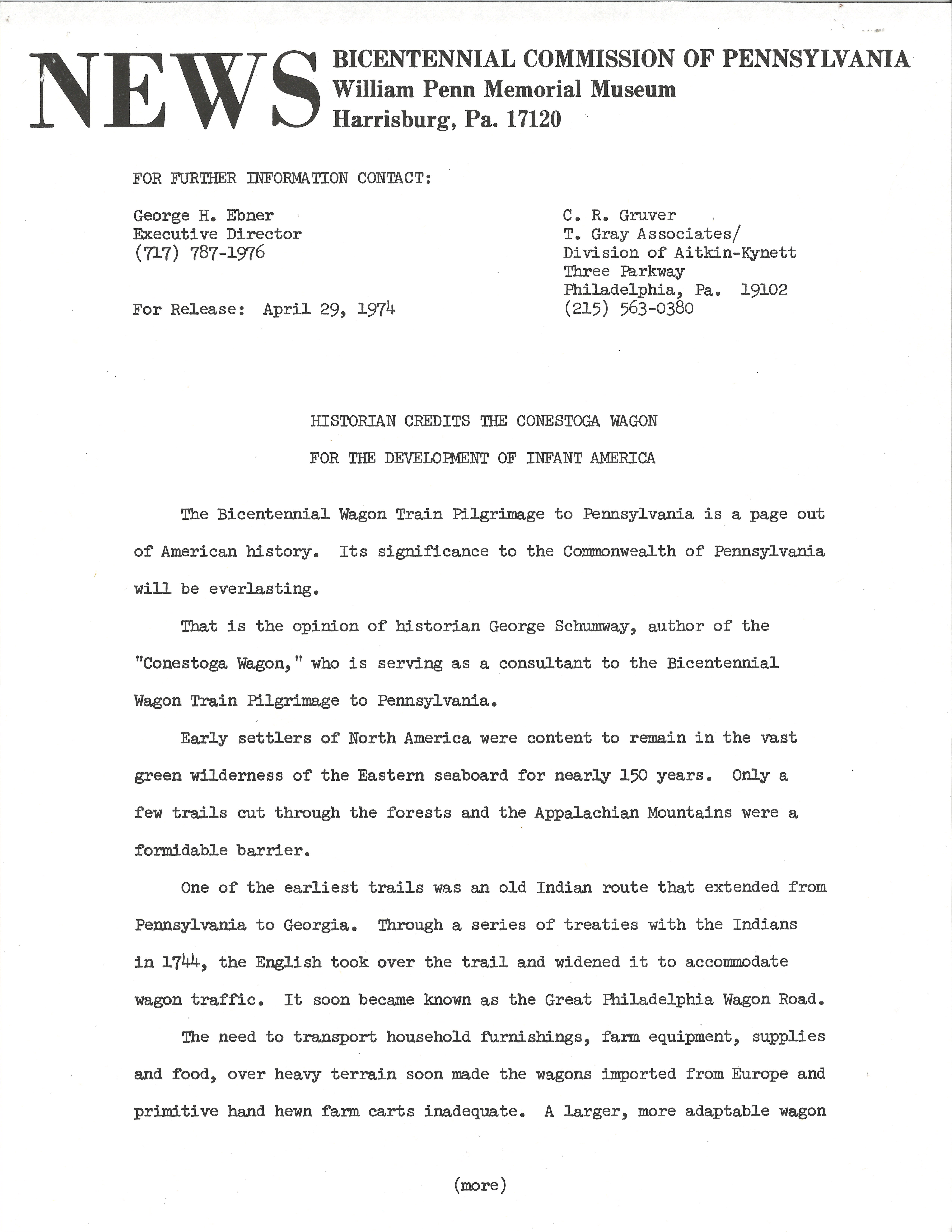 This press release is from the Bicentennial Commission of Pennsylvania. It highlights the history of the Great Philadelphia Wagon Road and the important role the Conestoga wagon, which was invented and built in Pennsylvania.