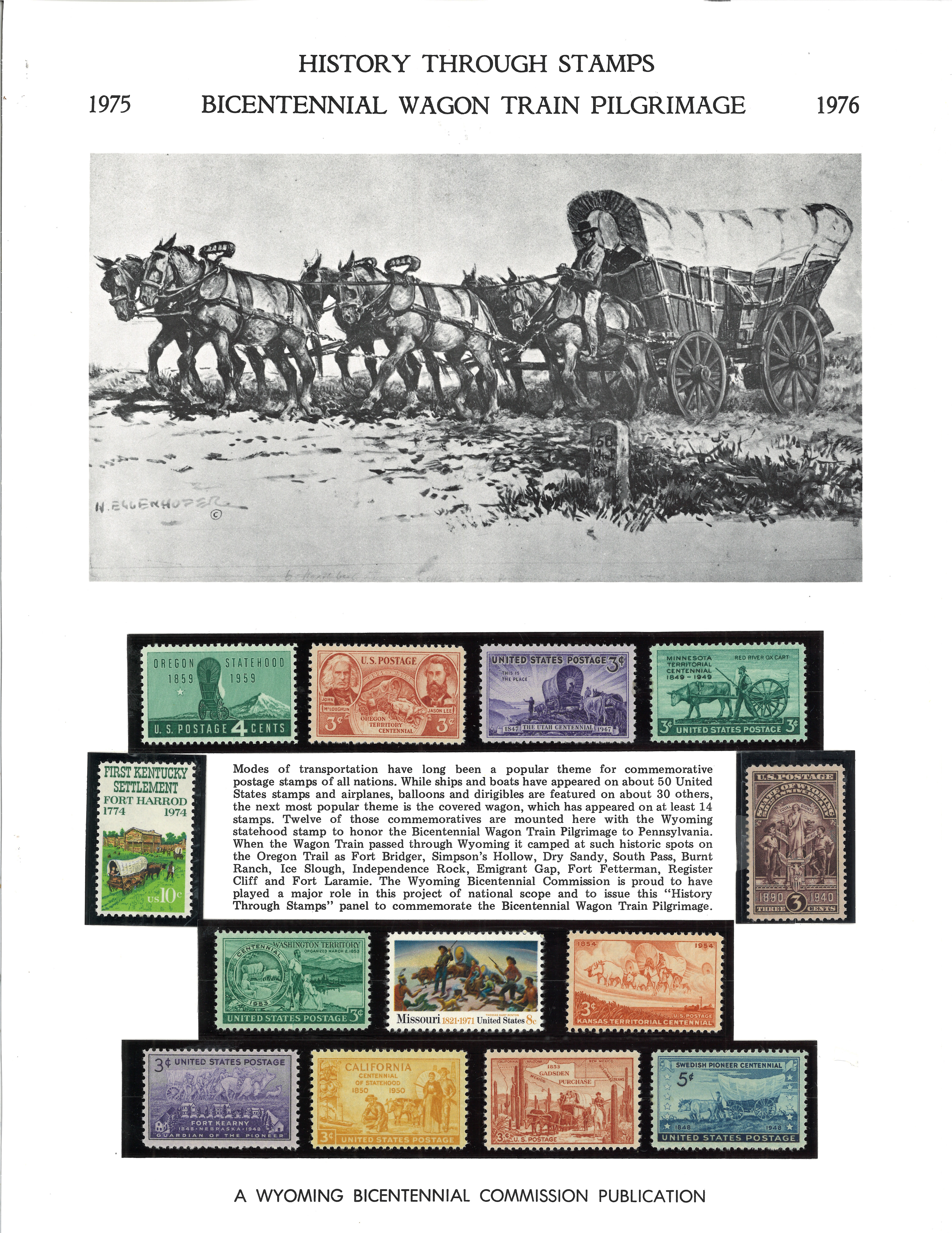 This set of commemorative stamps was issued under the direction of the Wyoming Bicentennial Commission. It commemorates the Bicentennial Wagon Train Pilgrimage that passed through Wyoming as part of Bicentennial festivities in 1975 and 1976.