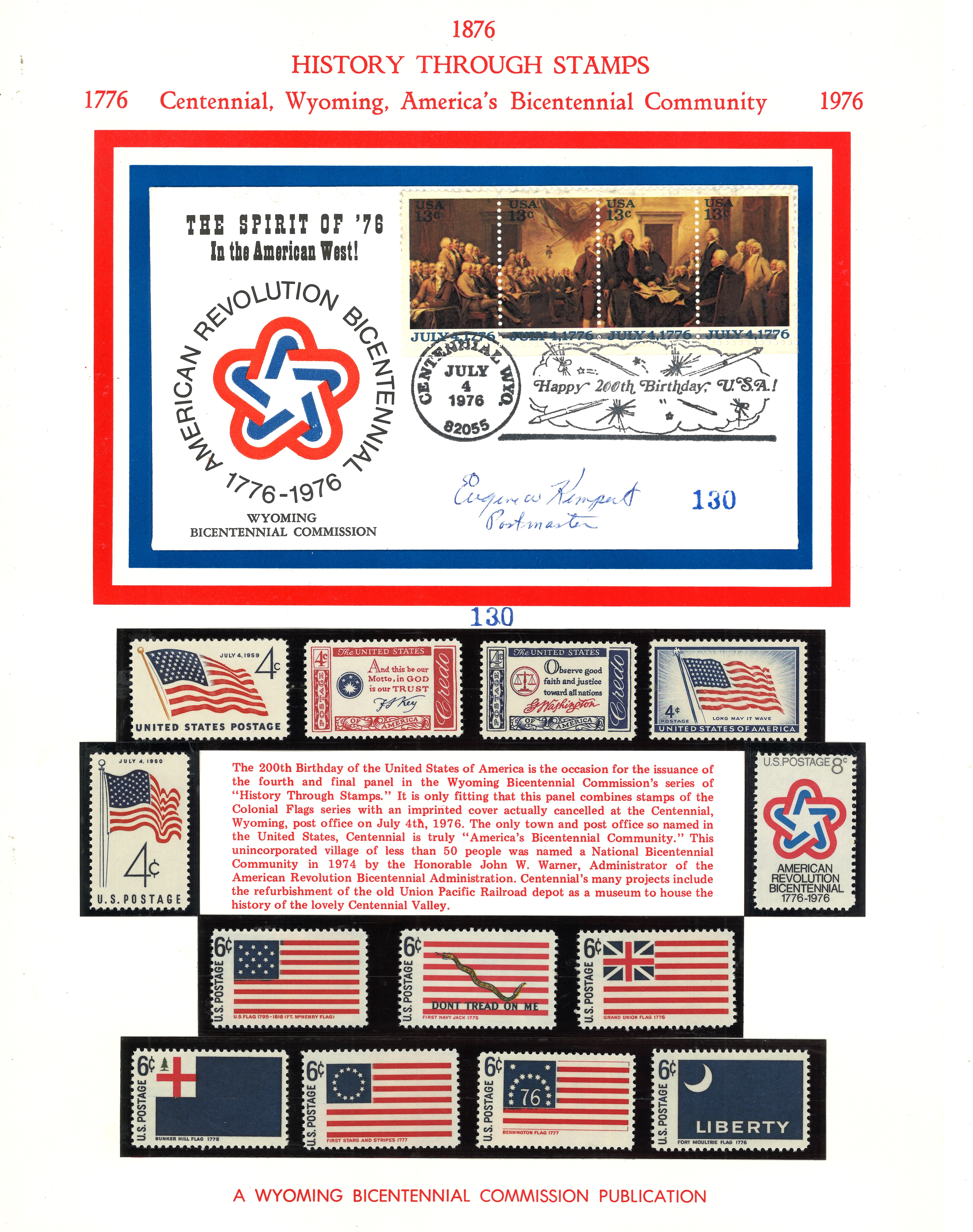 This limited edition set of commemorative stamps and postmarked envelope was issued under the direction of the Wyoming Bicentennial Commission. The envelope was cancelled on July 4, 1976 at the post office in Centennial, Wyoming.