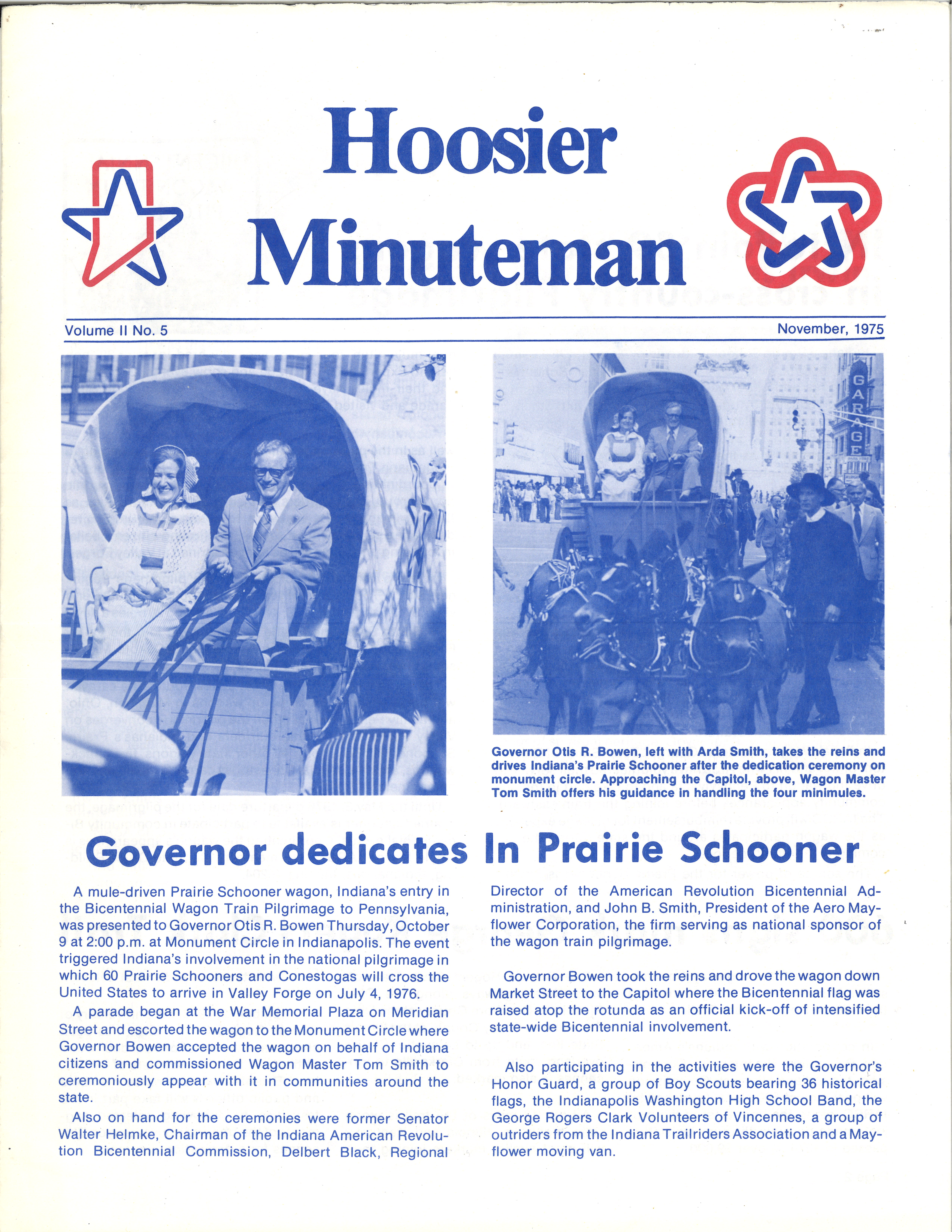 This newsletter, published by the Indiana American Revolution Bicentennial Commission, reports on some of the many Bicentennial-related activities that have happened or are scheduled to happen throughout Indiana. The feature story of the newsletter is about Indiana's entry of a mule-driven Prairie Schooner wagon in the Bicentennial Wagon Train Pilgrimage to Pennsylvania.