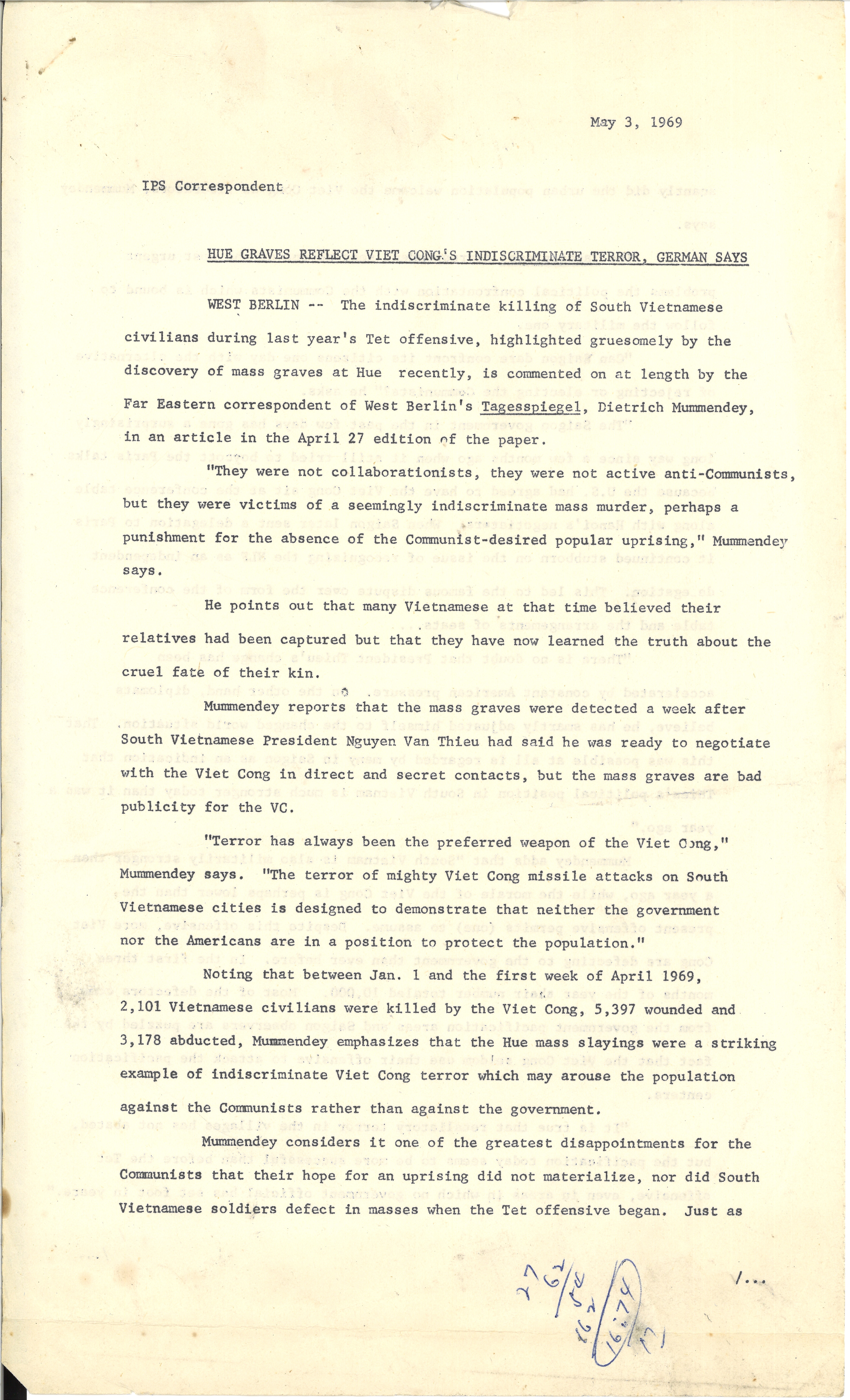 "Hue Graves Reflect Viet Cong's Indiscriminate Terror, German Says", May 3, 1969