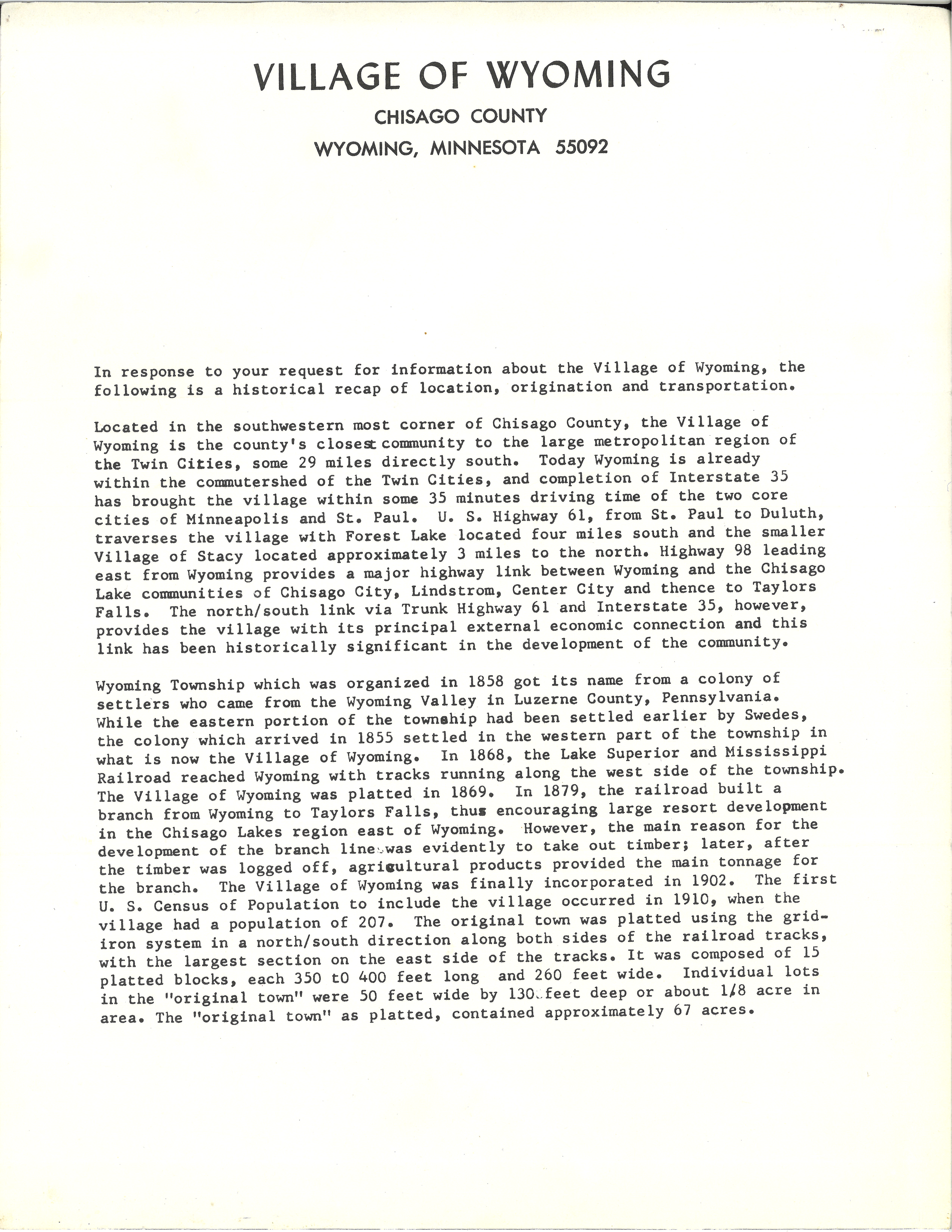 This letter from the Mayor of the village of Wyoming, Minnesota describes some of the village's history.