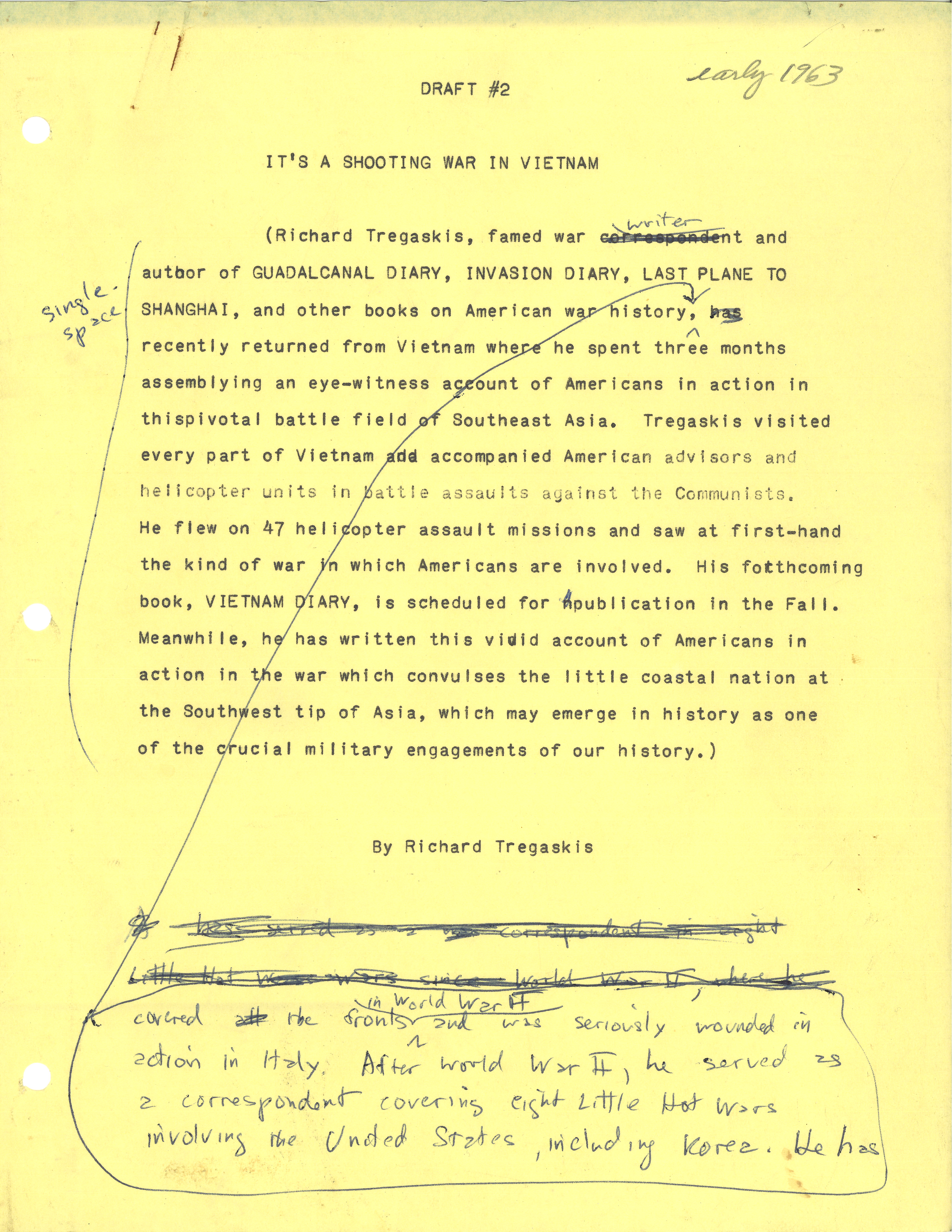 In this draft article, Tregaskis describes America’s active and dangerous role in the Vietnam War, showing that U.S. forces are deeply involved in combat, not just training. Through detailed accounts of helicopter missions, ambushes, and battles, he highlights the bravery and risks faced by American advisors, pilots, and Special Forces fighting alongside South Vietnamese troops.