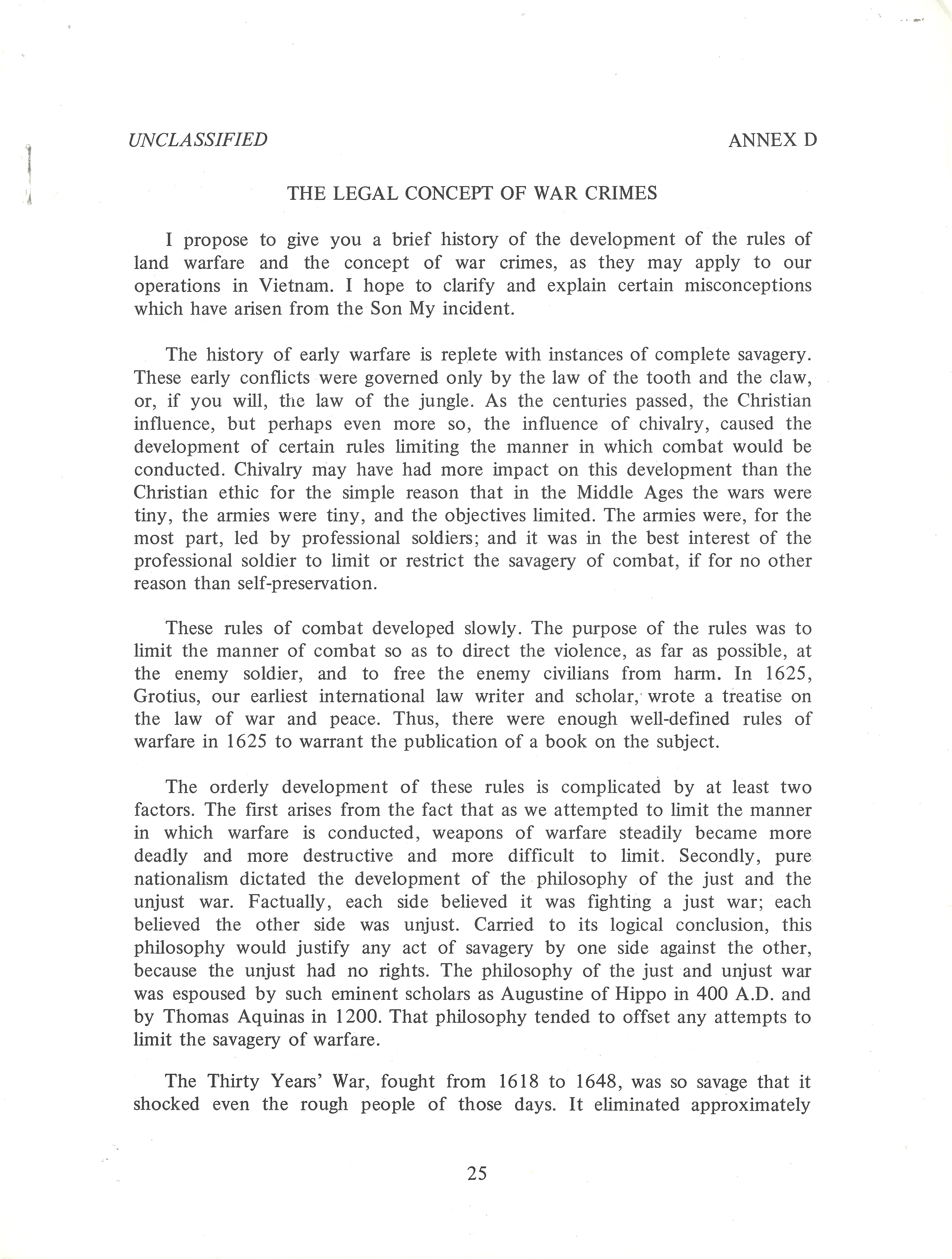 This document explains the historical development and modern understanding of war crimes, focusing on how laws of warfare evolved to limit unnecessary suffering and protect civilians. It reviews historical examples—showing how accountability for atrocities shifted from nations to individual soldiers and commanders. The text emphasizes that military leaders must act responsibly to prevent and investigate war crimes, even amid the challenges of modern conflicts like Vietnam.