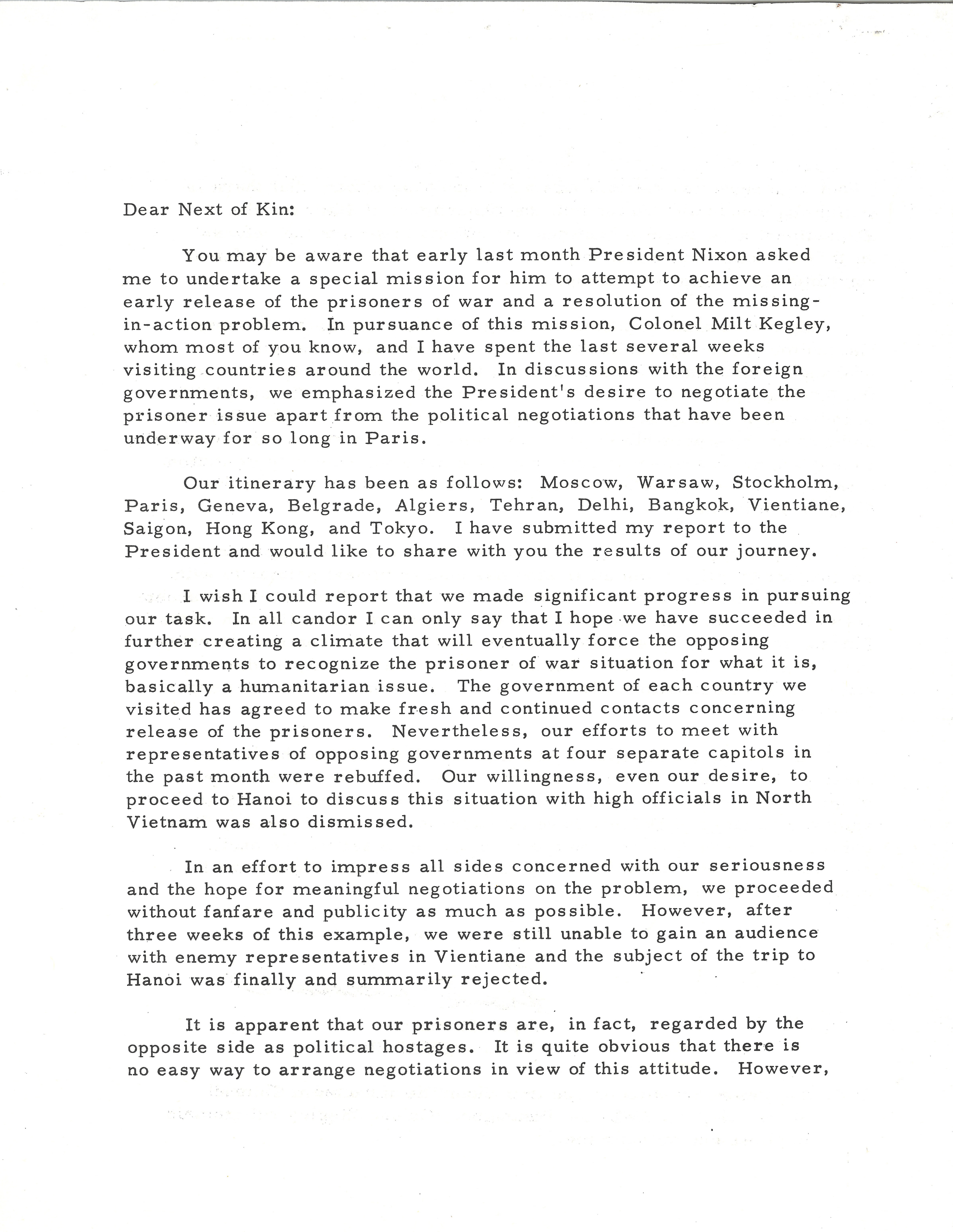 This letter is from Borman to the families of prisoners of war and missing in action. Borman's mission, ordered by President Nixon, was to win the release of American prisoners of war and account for the missing, but North Vietnamese officials refused to meet with him. He said that many governments around the world promised to raise the issue, but the enemy continued to treat prisoners as political hostages. Borman assured families that the U.S. government was determined to keep working, and he believed the International Red Cross was the best way to ensure prisoners’ proper care and eventual release.
