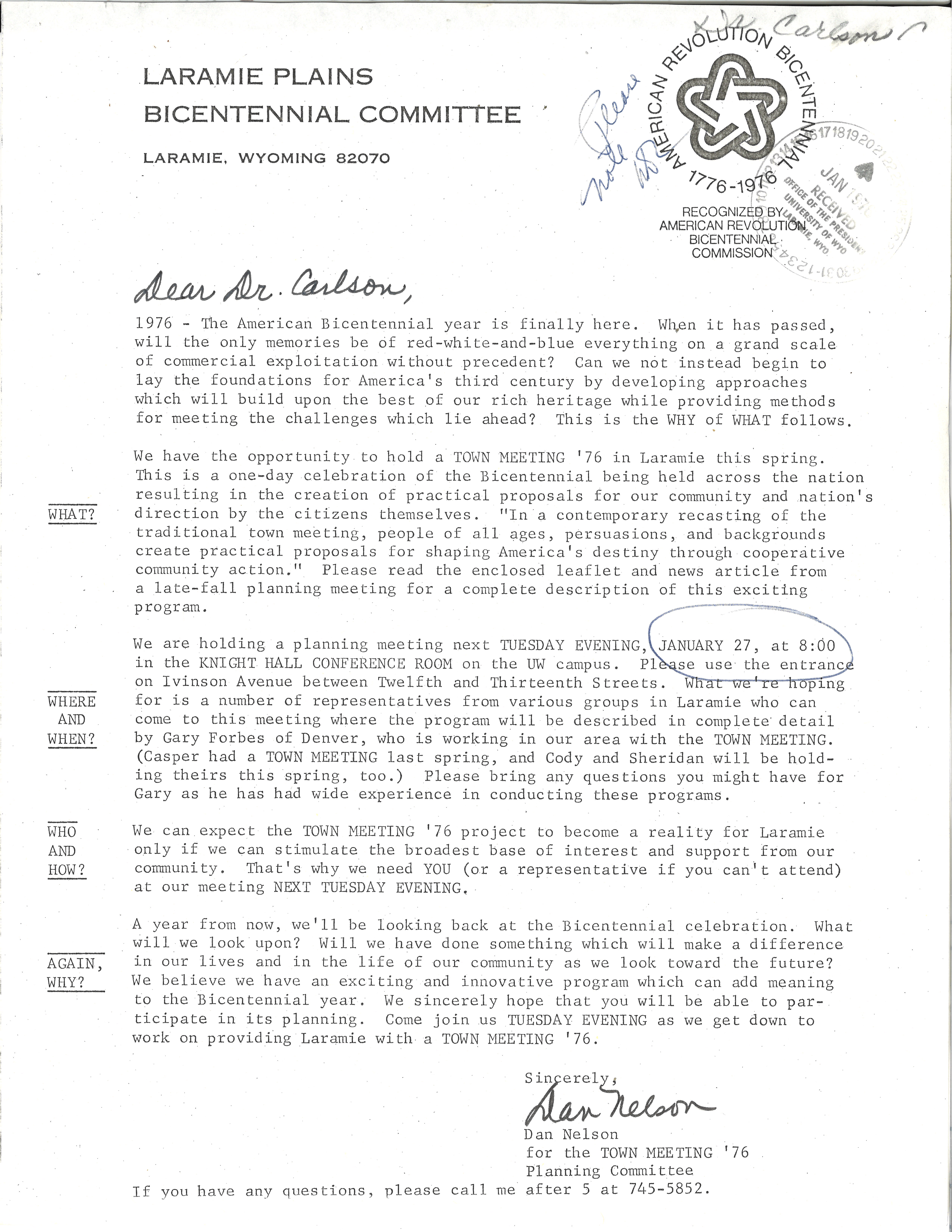 This letter from Nelson to the President of the University of Wyoming asks for his support for the Bicentennial Town Meeting '76 project in Laramie.
