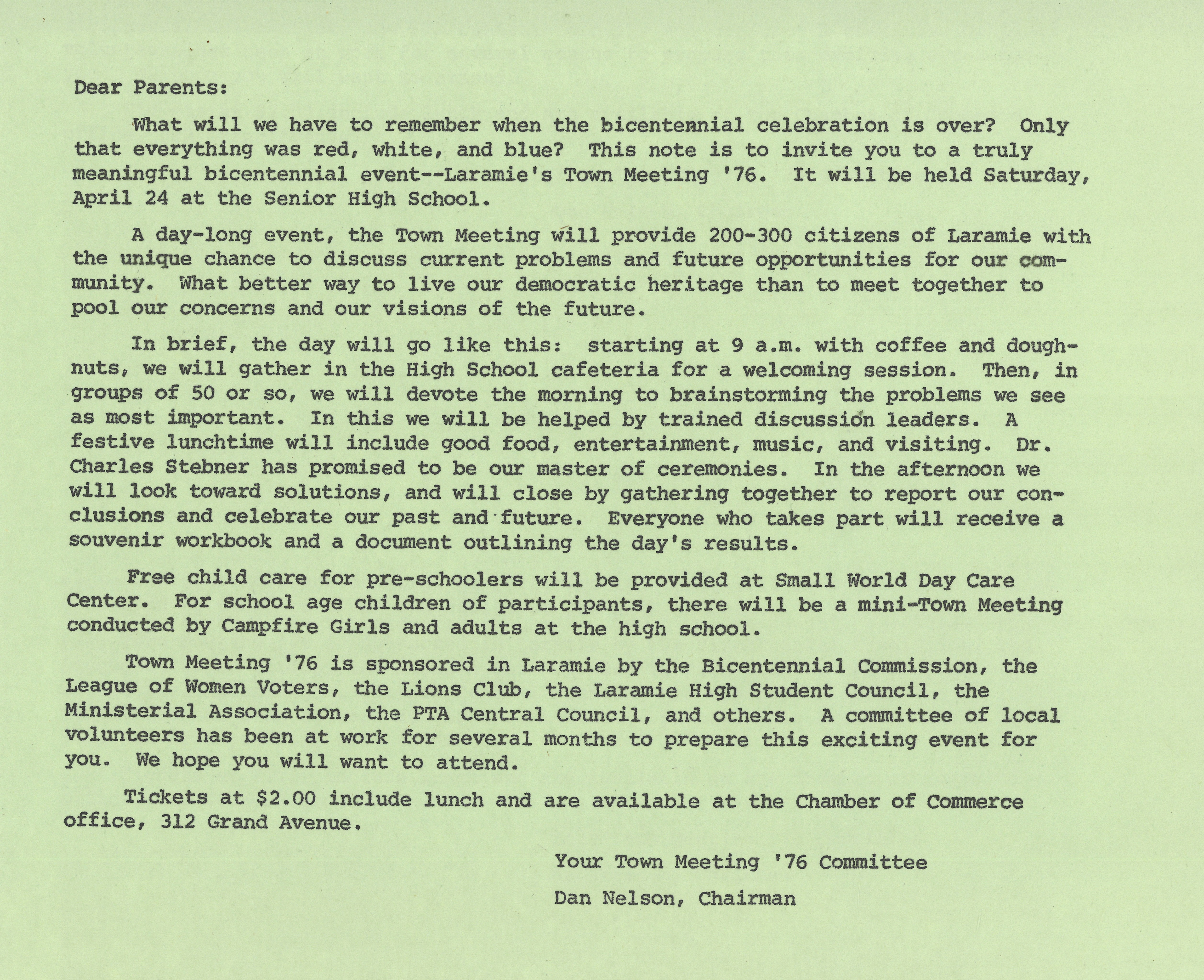 Letter from Dan Nelson to Laramie elementary school parents, April 20, 1976