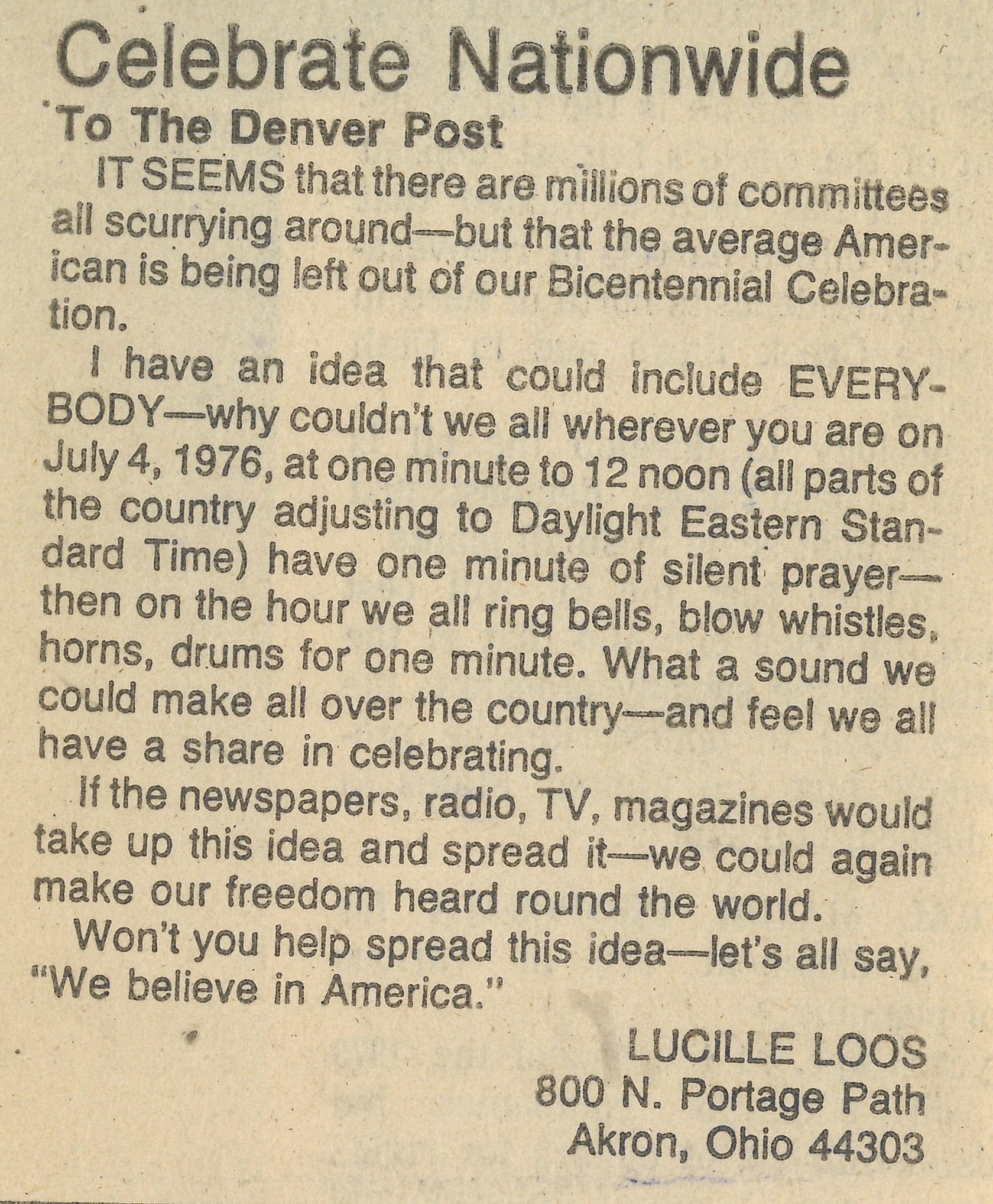This letter proposes a nationwide minute of prayer followed by bell ringing, horn honking, whistle blowing & drum banging on July 4, 1976, so that all Americans could participate in the Bicentennial.
