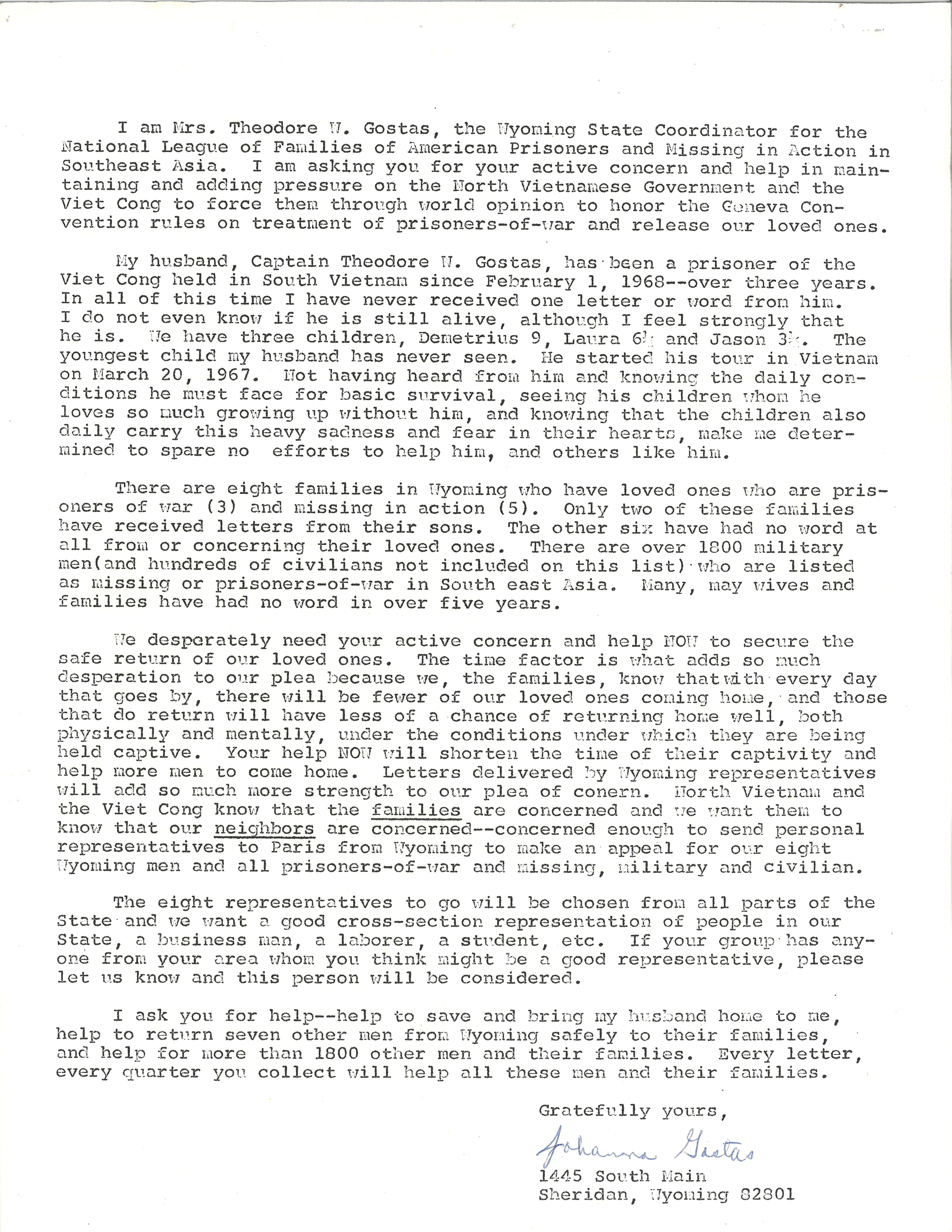 This letter from Johanna Gostas asks for support to put pressure on the North Vietnamese government and the Viet Cong to follow international rules and release American prisoners of war. By the time this letter was written, her husband, Captain Theodore Gostas, had been missing for over three years without any proof of life.