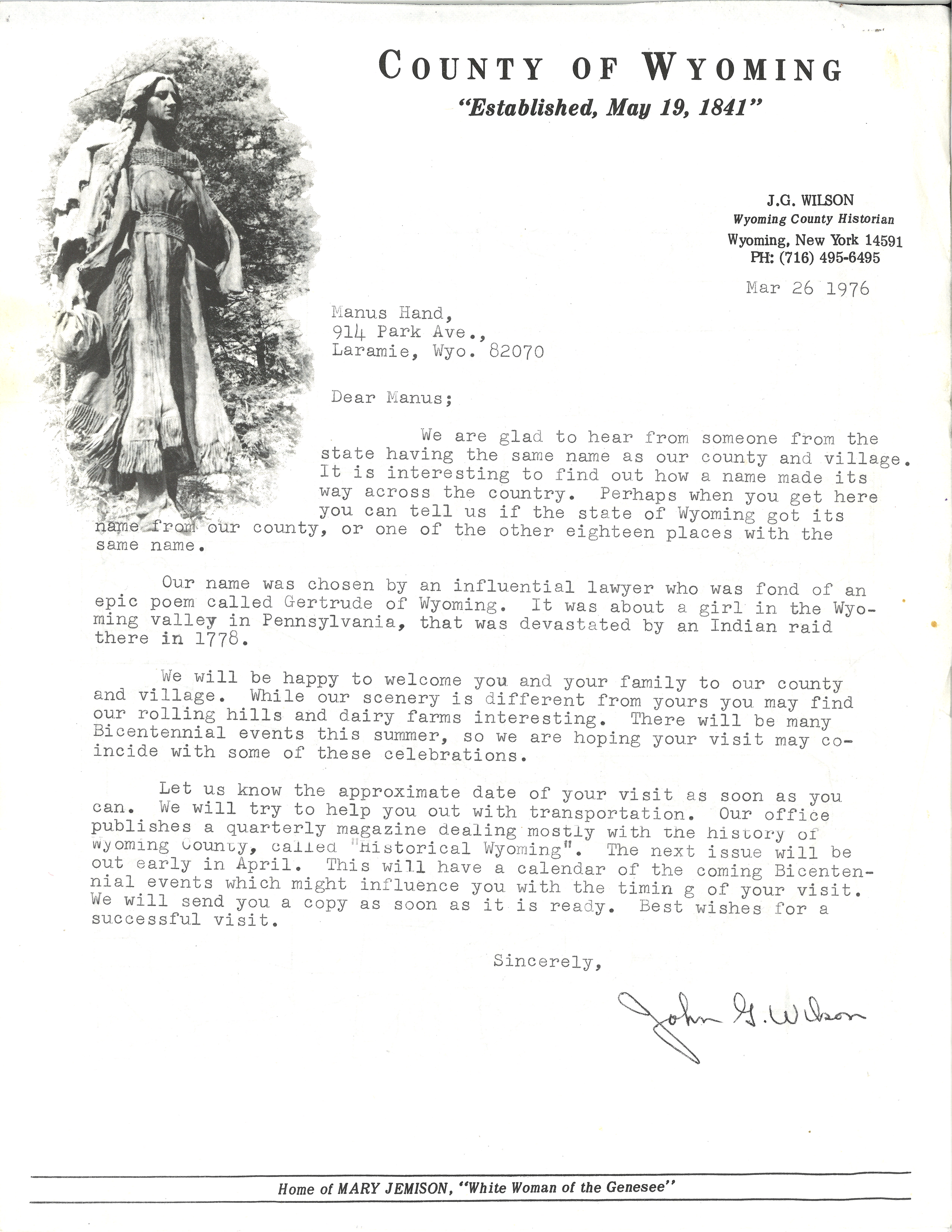 Wilson, the Wyoming, New York, County Historian, writes to Hand about Hand's family's upcoming visit. He also provides some detail about the history of the naming of the County of Wyoming.
