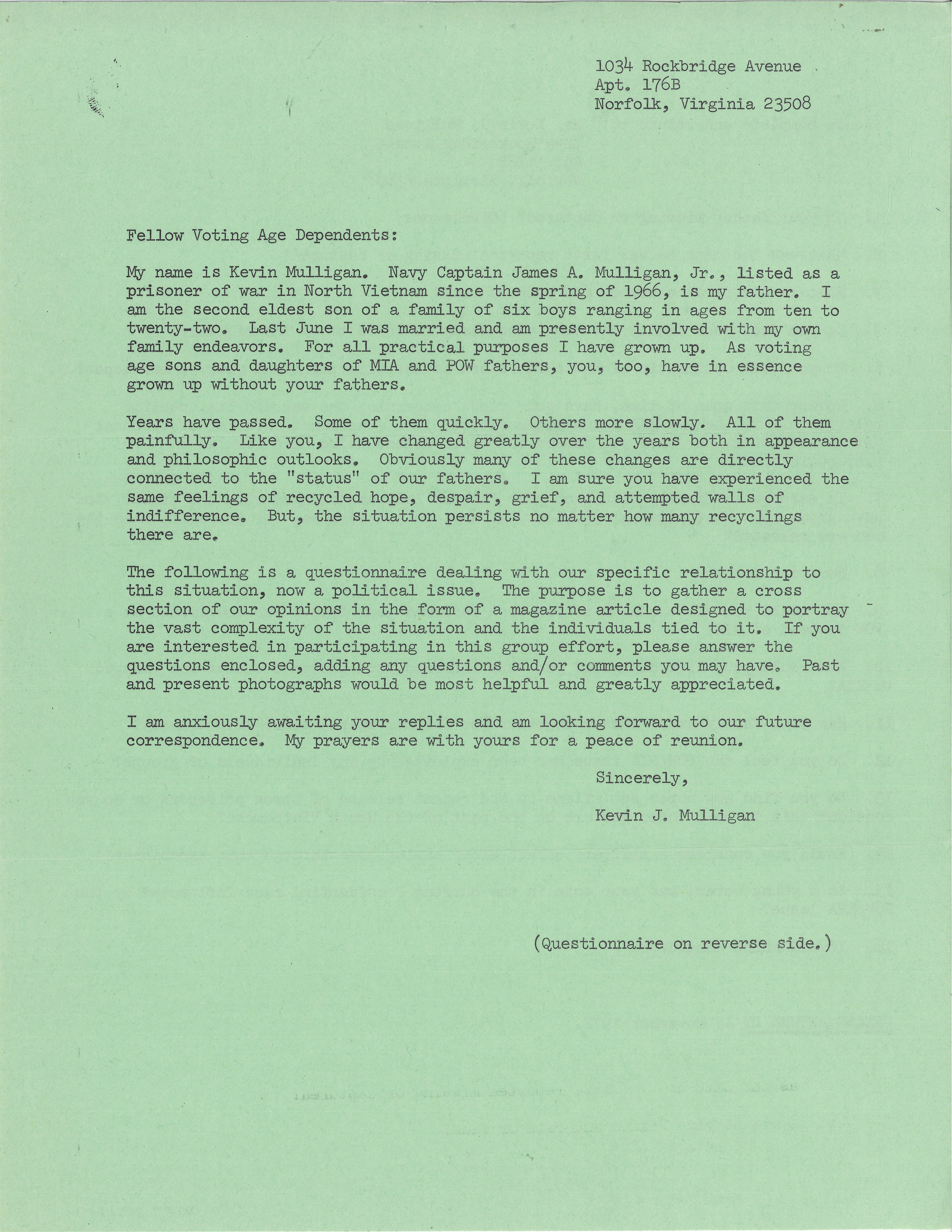 This letter, from the son of a prisoner of war, was sent out to other young adult children of prisoners of war or missing in action. It includes a survey, with the goal of gathering opinions for a magazine article.