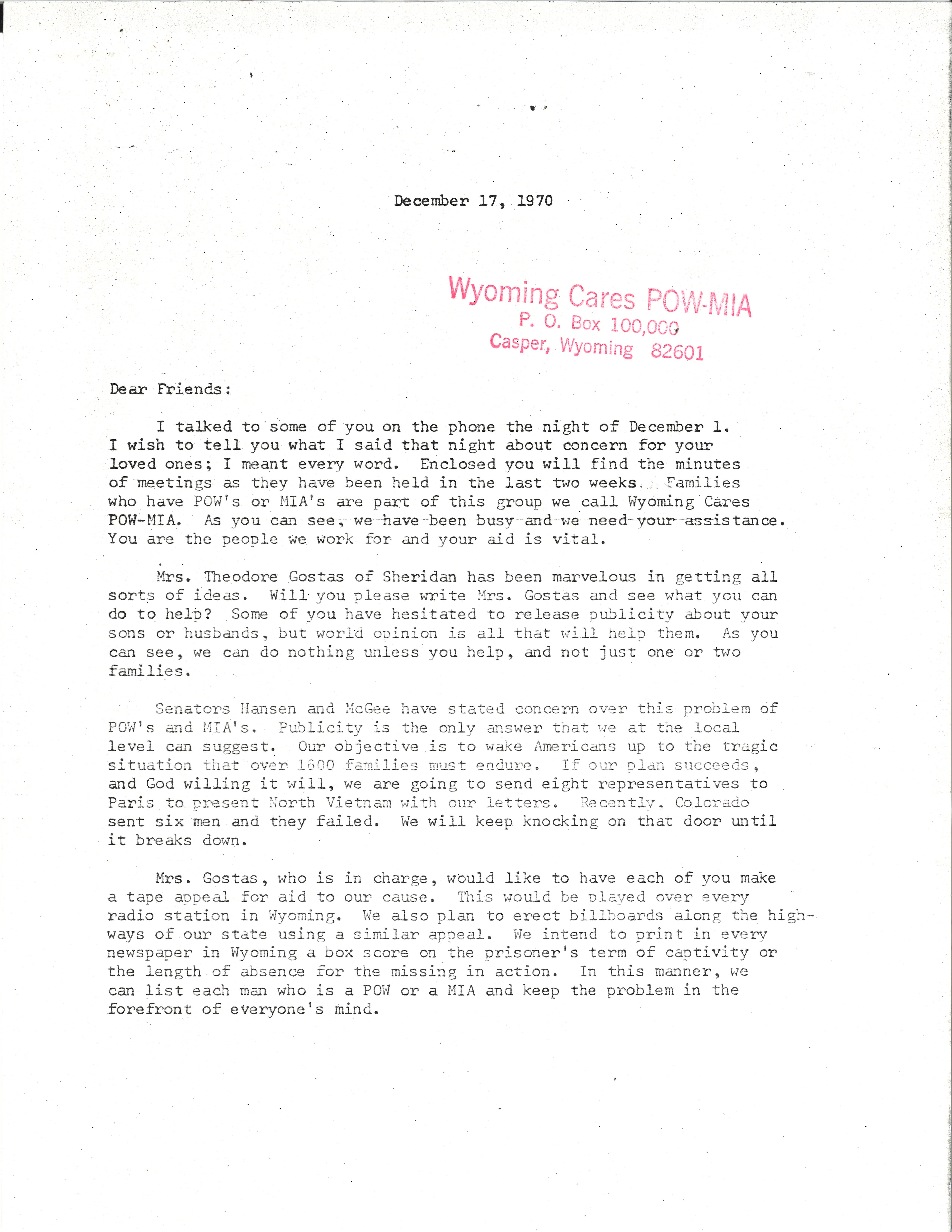 In this letter, Sanchez, who is the chairman of Wyoming Cares POW-MIA, writes encouraging POW-MIA families to share information about their captive loved ones to help raise awareness. He notes that Johanna Gostas is in charge of the family efforts, which include a plan to send representatives to Paris to present North Vietnamese officials with letters from Americans asking that the country abide by the Geneva Convention in its treatment and release of prisoners.