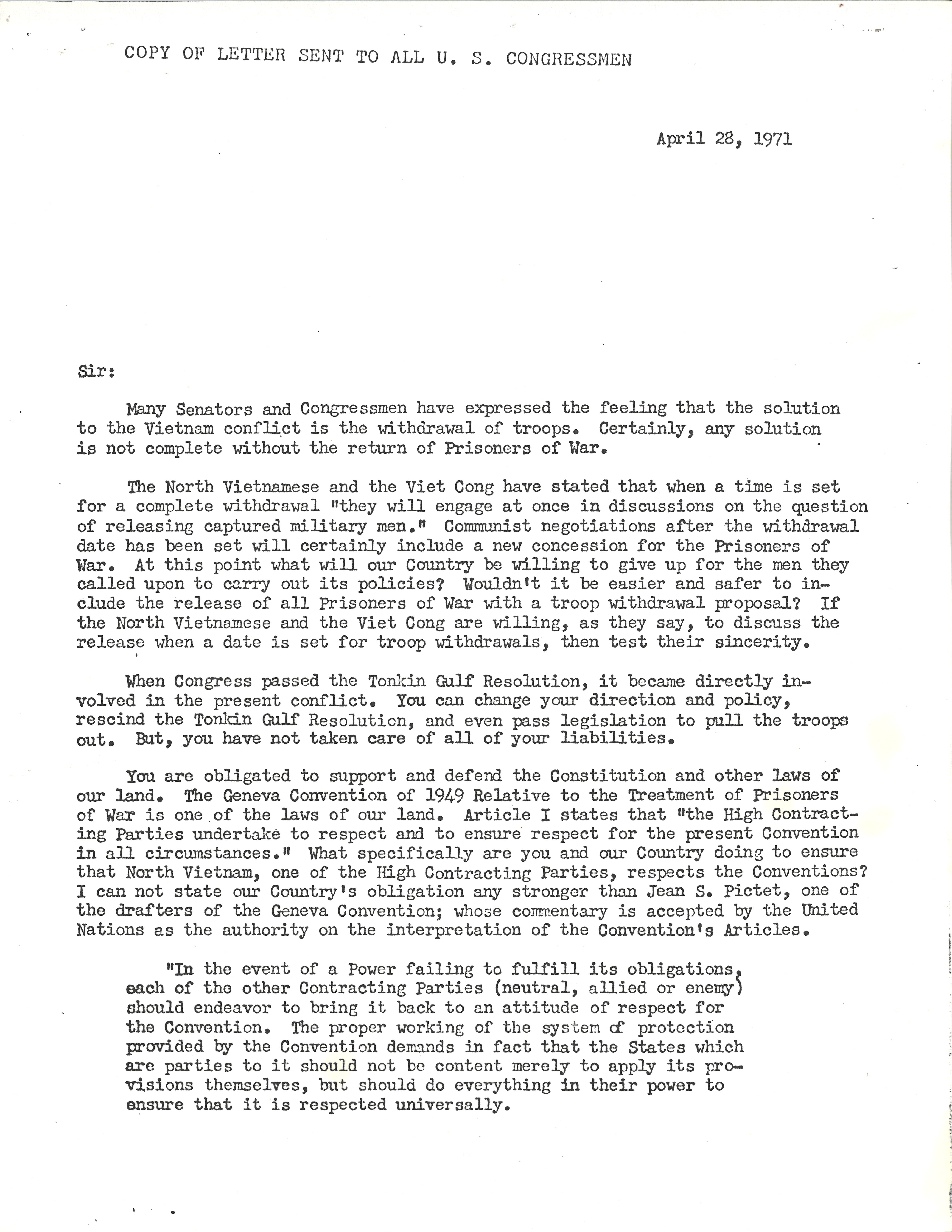 Frishman, who had been a prisoner of war in North Vietnam, addresses this letter to all members of the U.S. Congress. He urged them to make sure that American POWs were included in any Vietnam troop withdrawal plans. He explained that the U.S. had a legal and moral duty under the Geneva Convention to protect prisoners and push North Vietnam to release them.