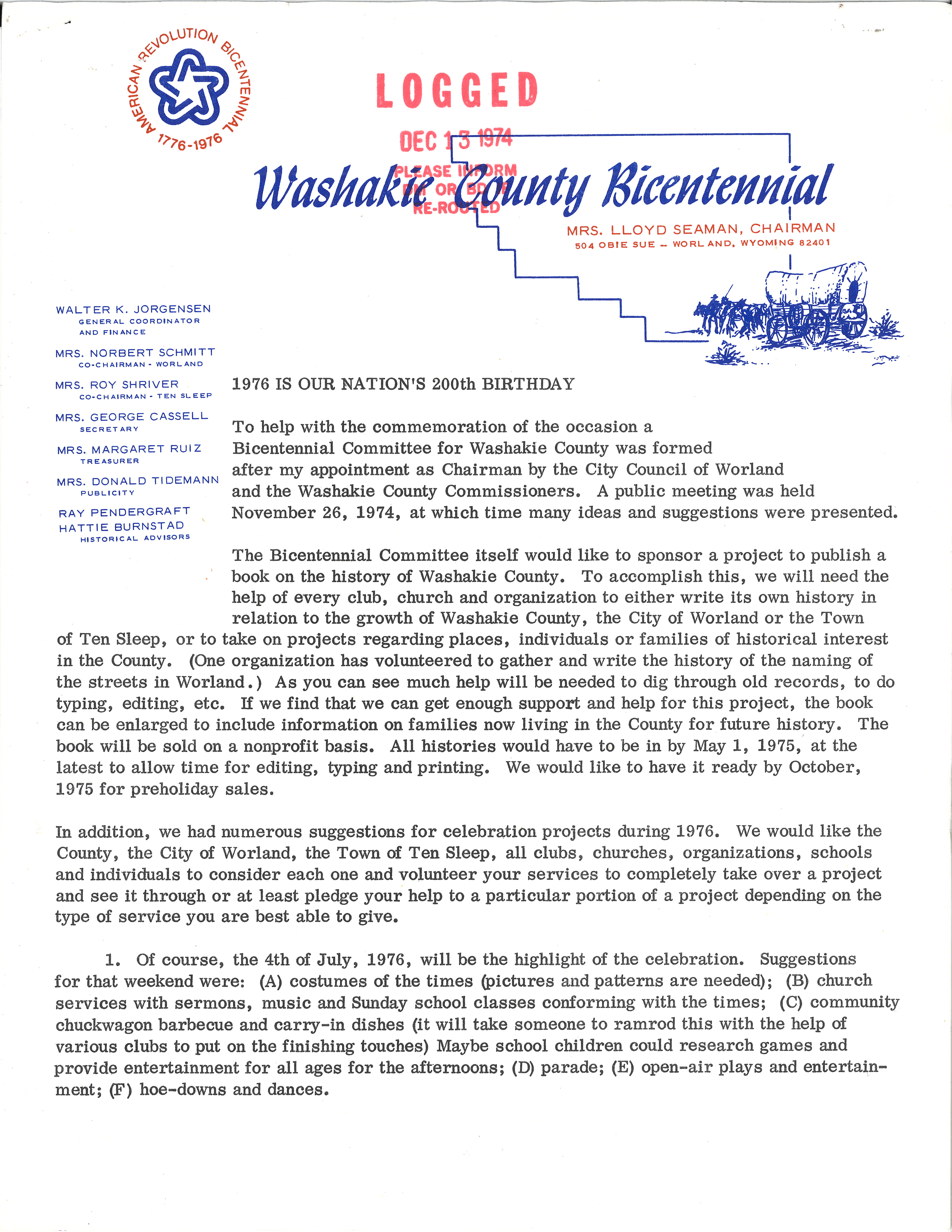 This letter from the Washakie County Bicentennial Committee outlines plans to celebrate America’s 200th birthday by creating a community history book and organizing events like parades, old-time games, and historical plays. It calls on local residents, clubs, and schools to volunteer and help make the celebration meaningful