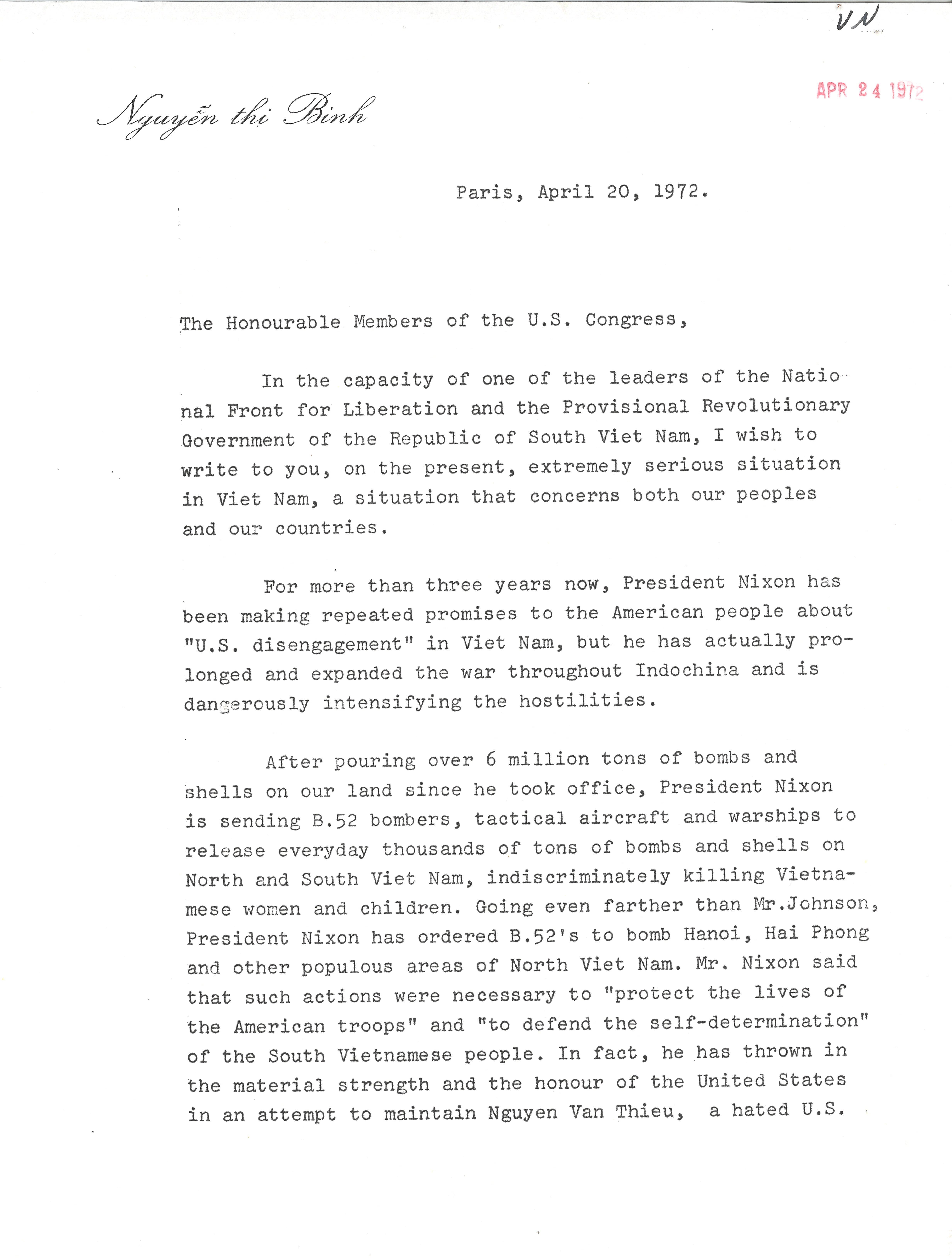 Letter from Nguyen Thi Binh to the members of the U.S. Congress, April 20, 1972