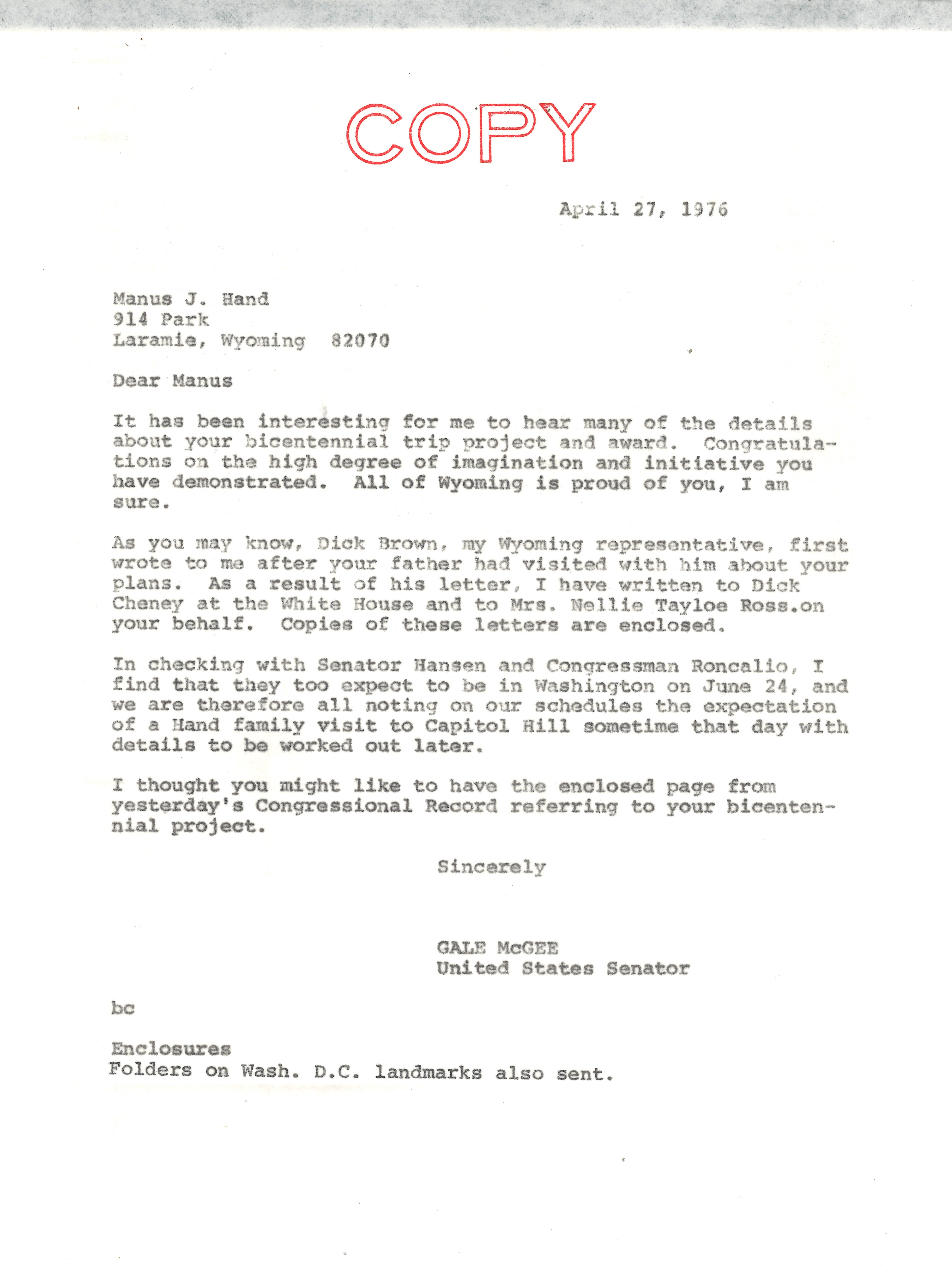 Letter from Senator Gale McGee to Manus Hand, April 27, 1976