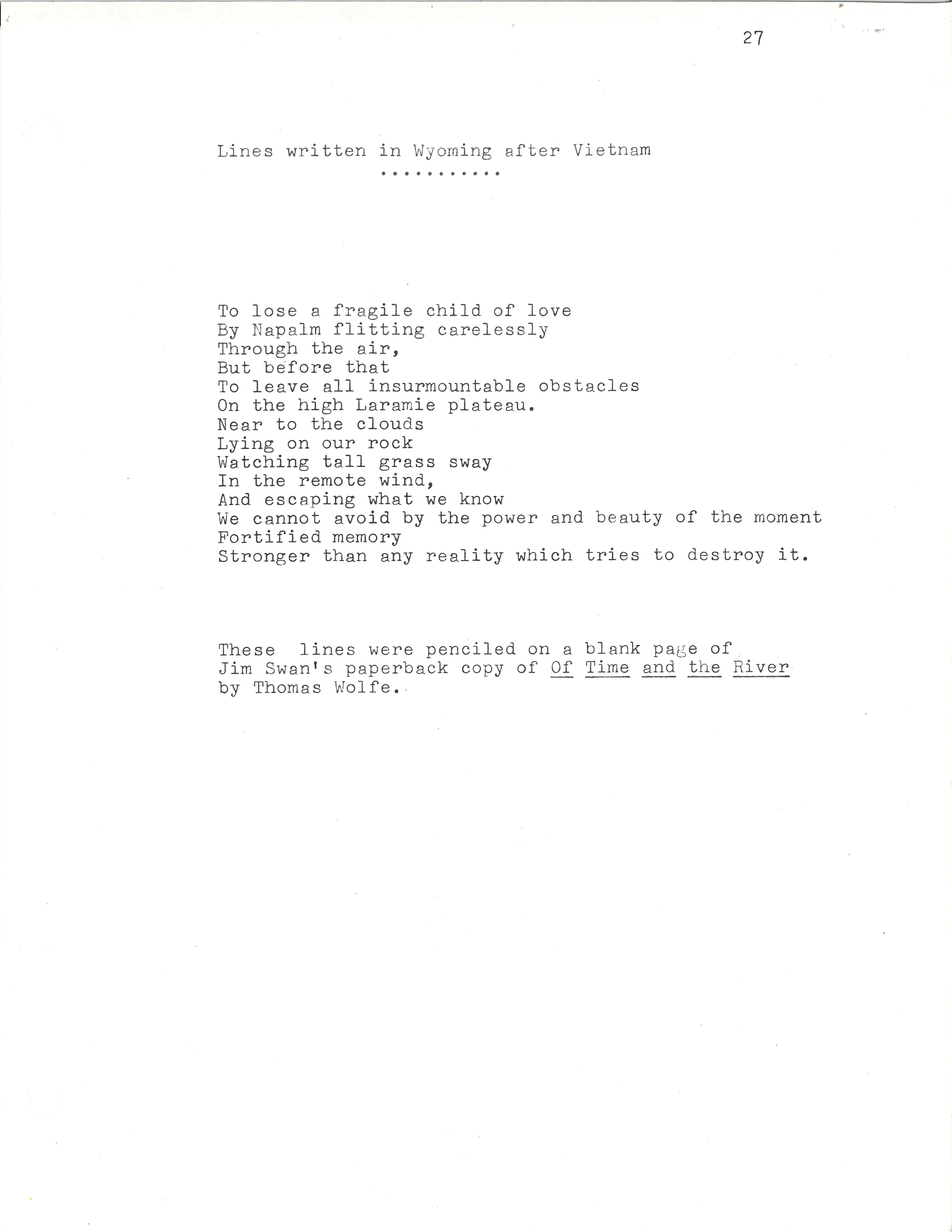 These lines were written by James (Jim) Swan after his return to Wyoming from Vietnam.