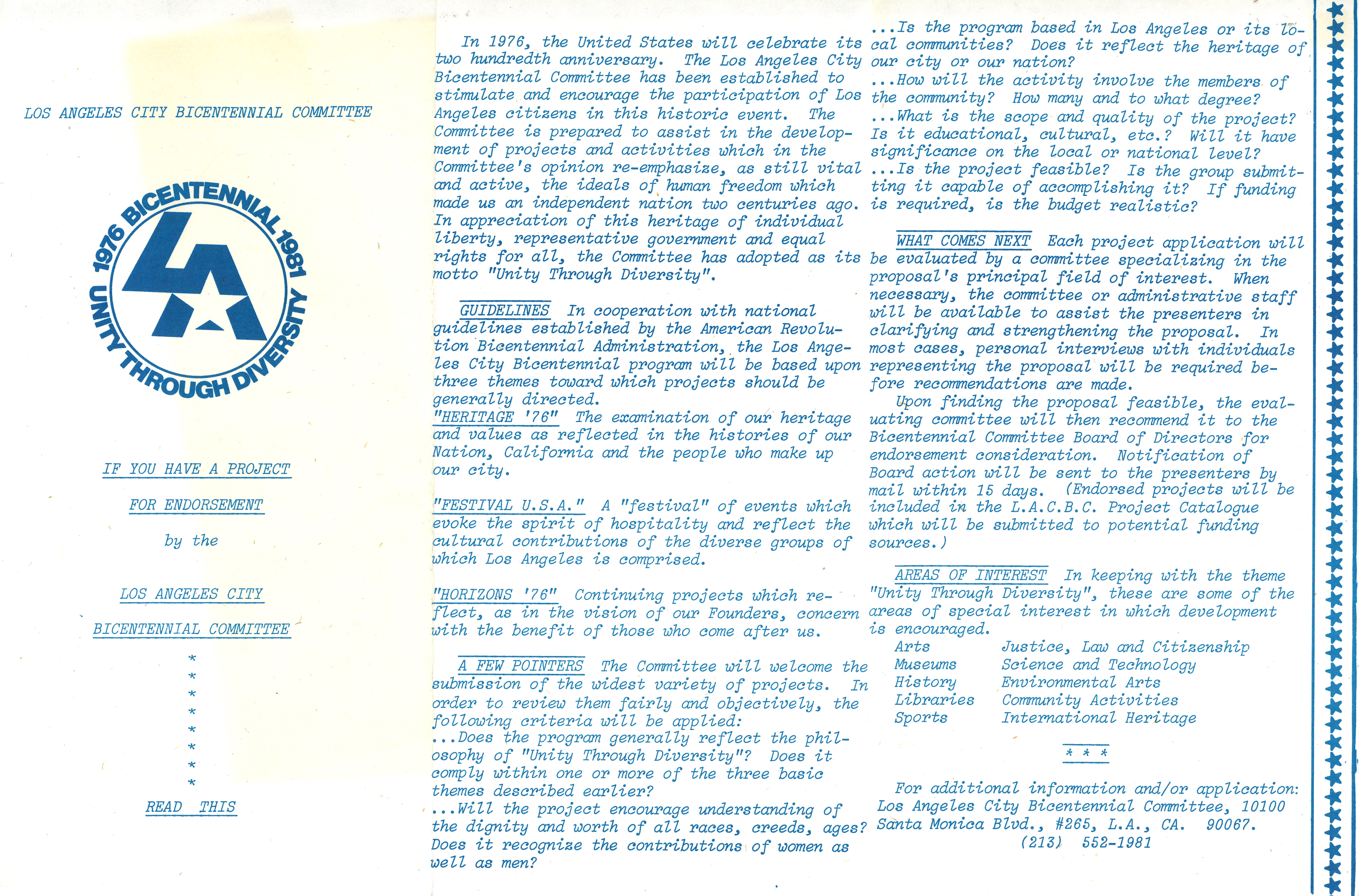 This pamphlet encourages citizens of Los Angeles to get involved in the Bicentennial by proposing projects in support of the theme of "Unity through Diversity".