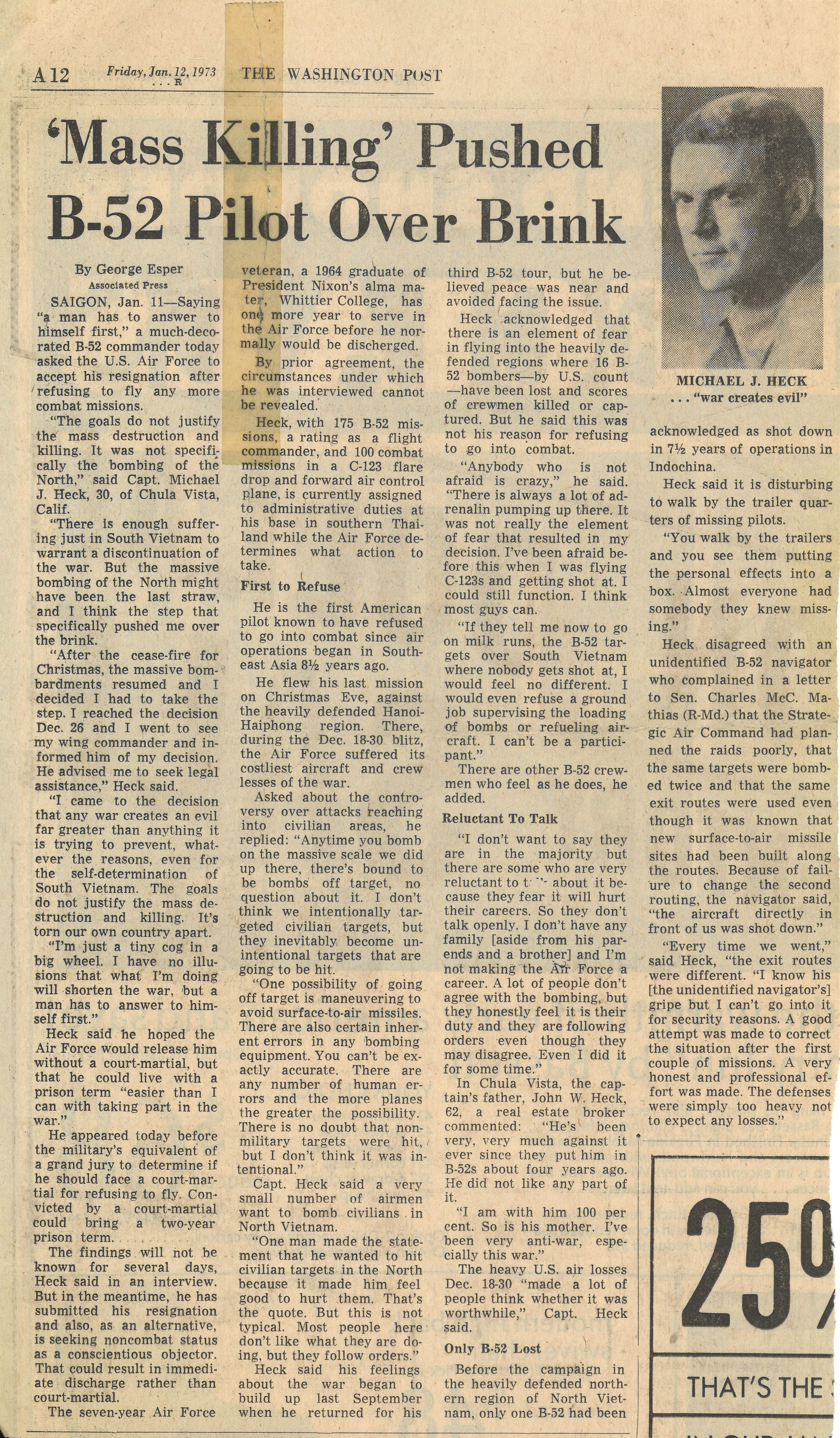 "'Mass Killing' Pushed B-52 Pilot Over Brink" by George Esper, The Washington Post, January 12, 1973
