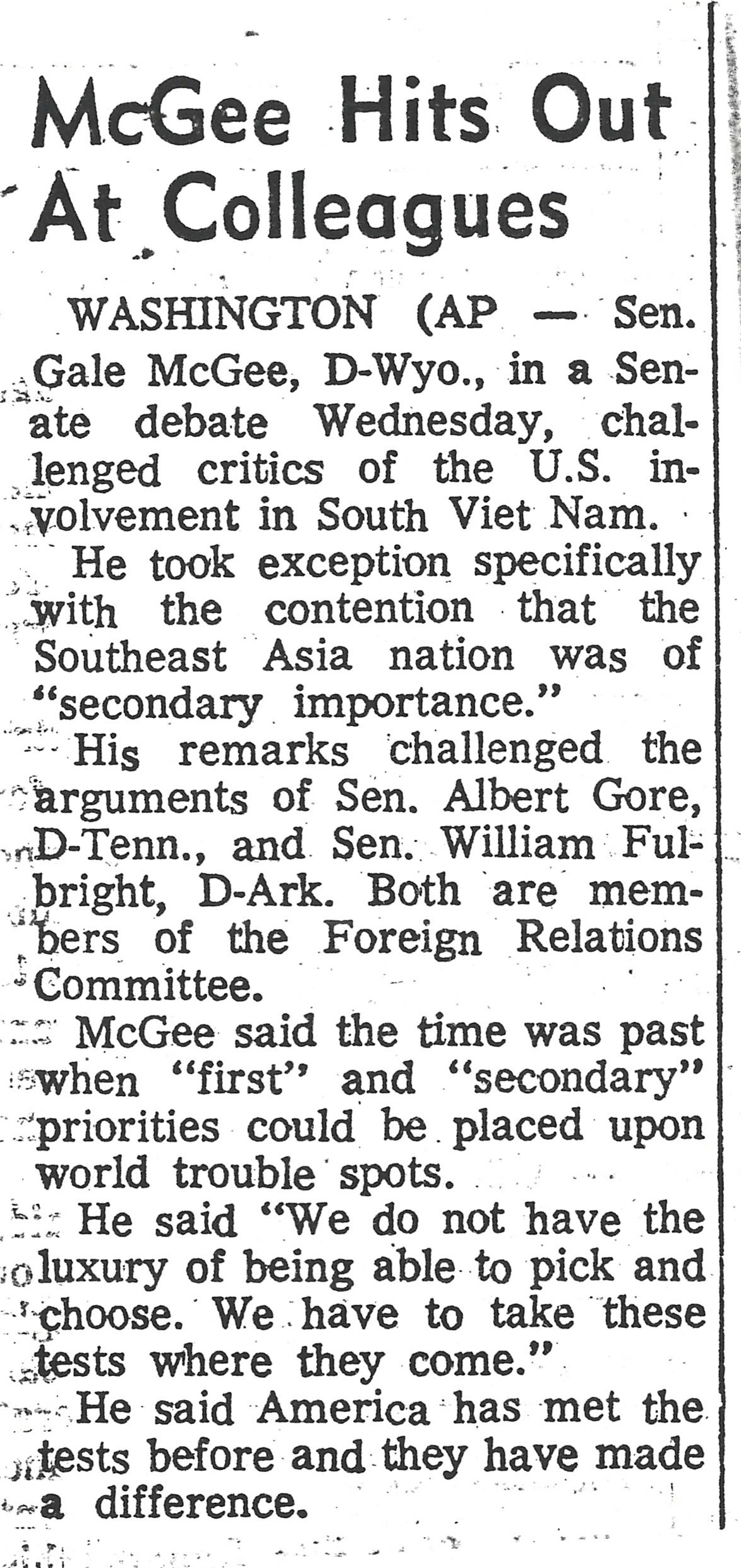 This brief newspaper article discusses Senator Gale McGee's debate with his U.S. Senate colleagues who have been critical of the U.S. involvement in South Vietnam.