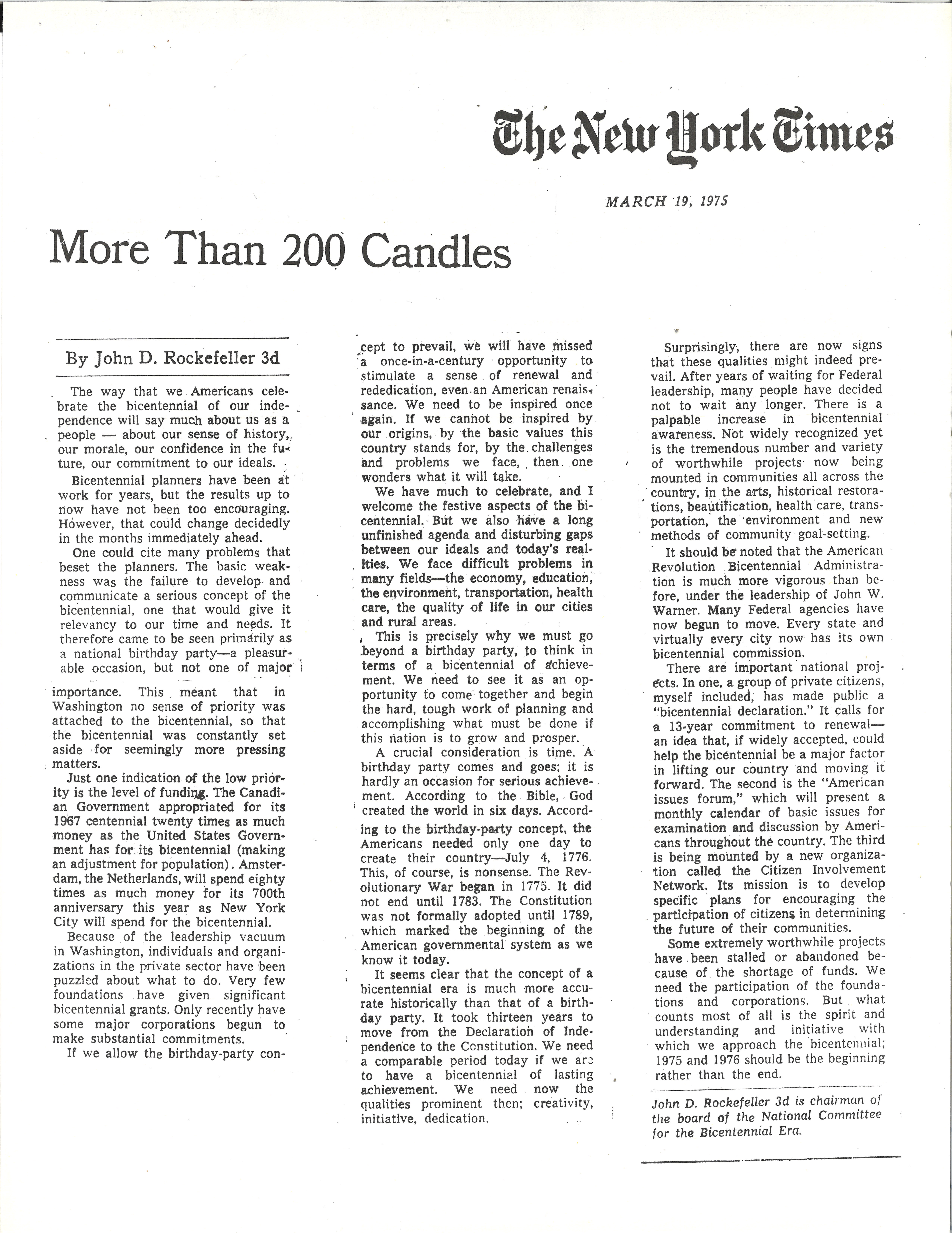 "More Than 200 Candles" by John D. Rockefeller 3d, The New York Times, March 19, 1975