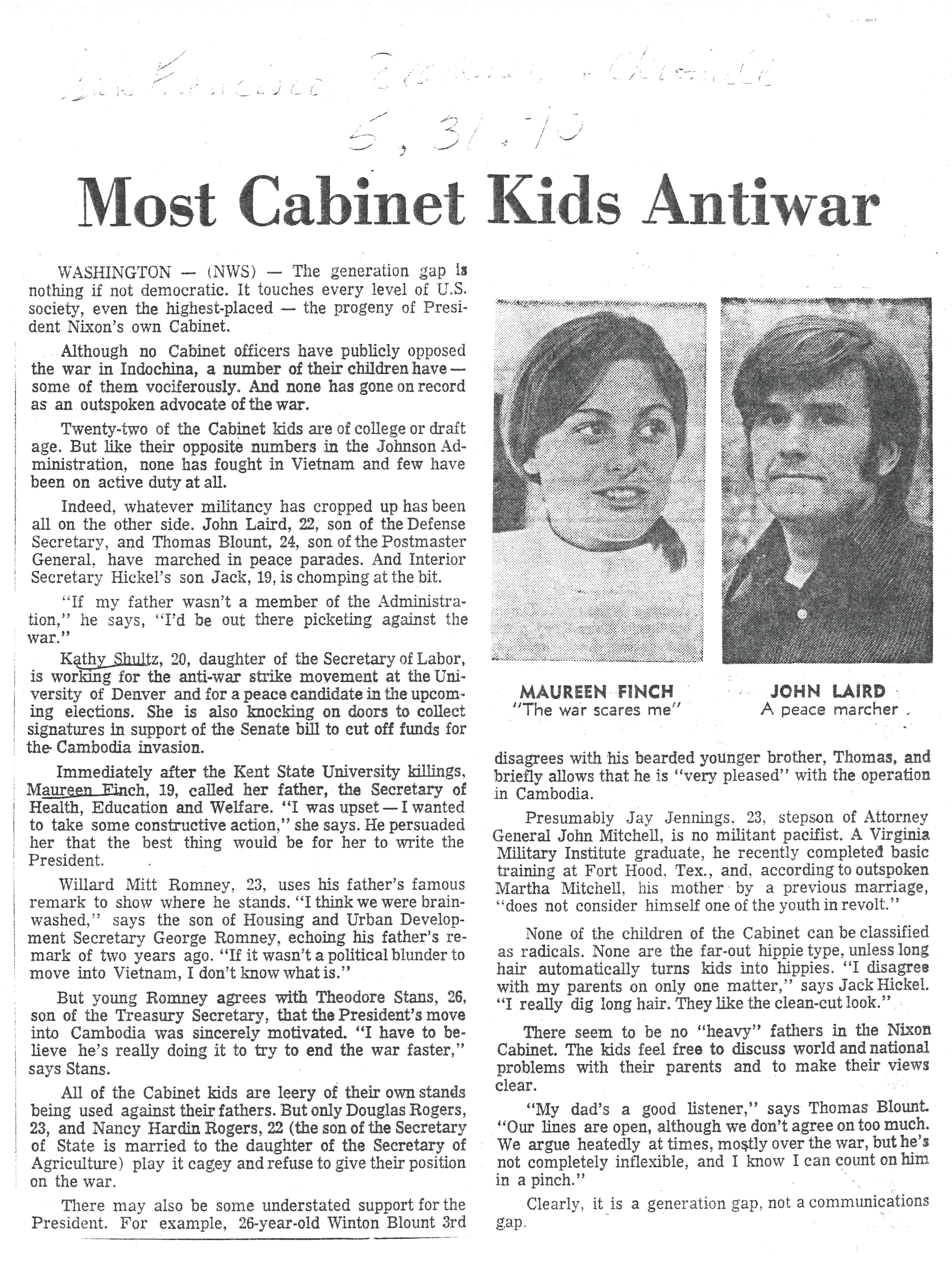 "Most Cabinet Kids Antiwar", San Francisco Examiner-Chronicle, May 31, 1970