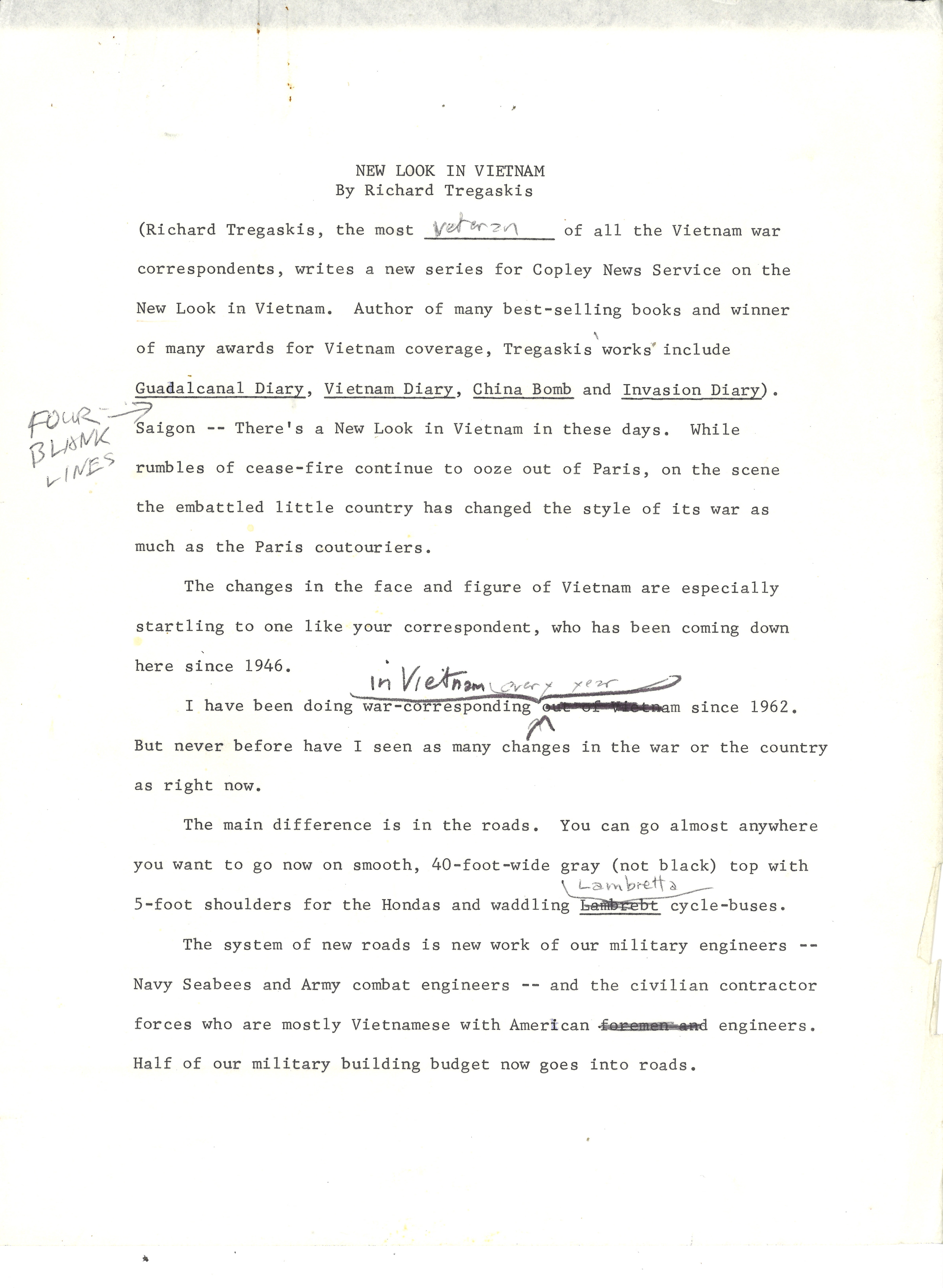 This is a draft of a three part article for Copley News Service. It describes changes the author has observed in Vietnam over the later years of the Vietnam War. It makes special note of the building of new roads, bases, and infrastructure by American and Vietnamese workers. These projects improved transportation and created job opportunities—many of them for women, who worked as builders, contractors, and business owners.