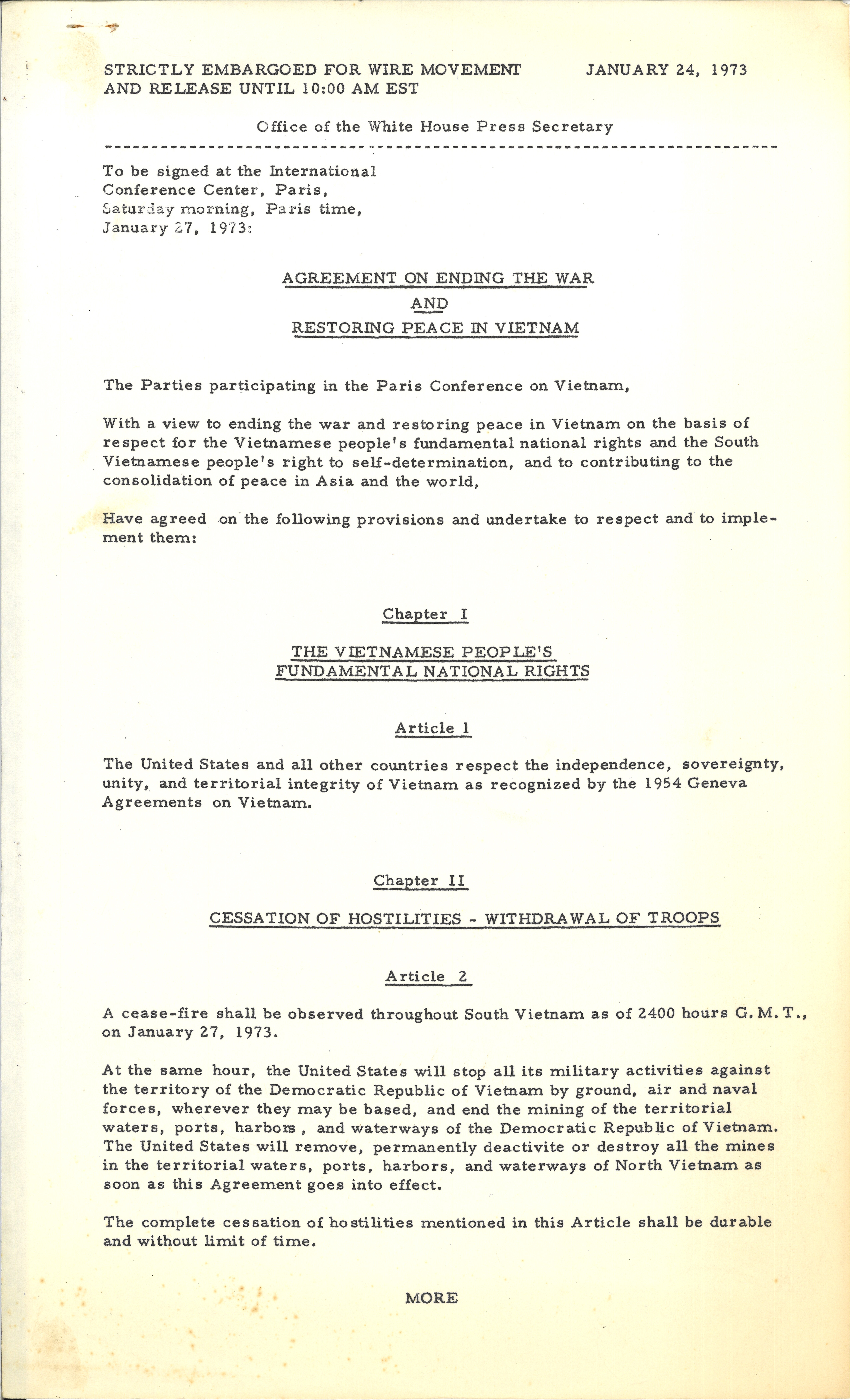 Paris Peace Accords Press Release - Agreement On Ending The War And Restoring Peace In Vietnam, January 24, 1973