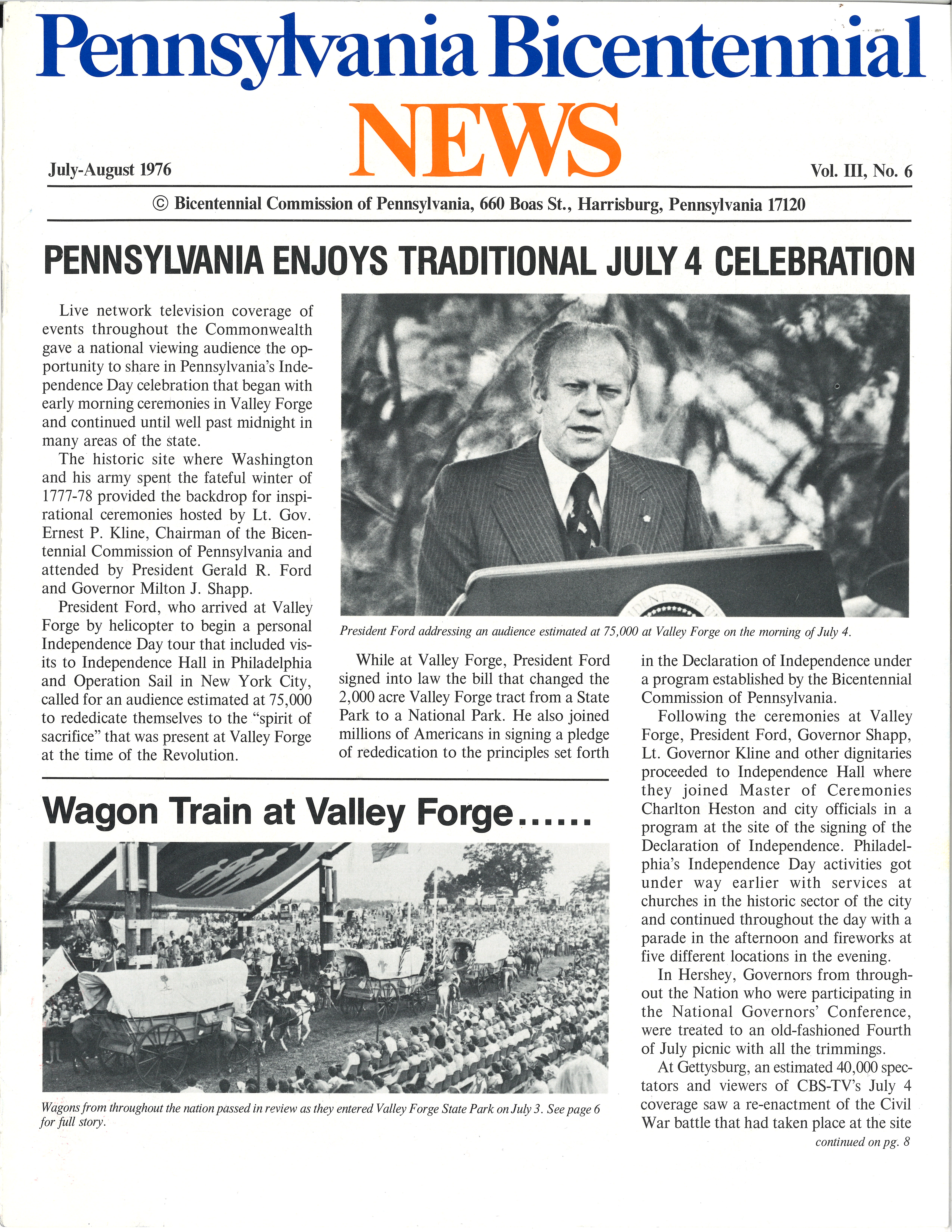 This newsletter, published by the Bicentennial Commission of Pennsylvania, reports on some of the many Bicentennial-related activities that have happened or are scheduled to happen throughout Pennsylvania. Featured stories cover the arrival of the Bicentennial Wagon Train at Valley Forge on July 3, 1976 and President Ford's address at Valley Forge on July 4, 1976.