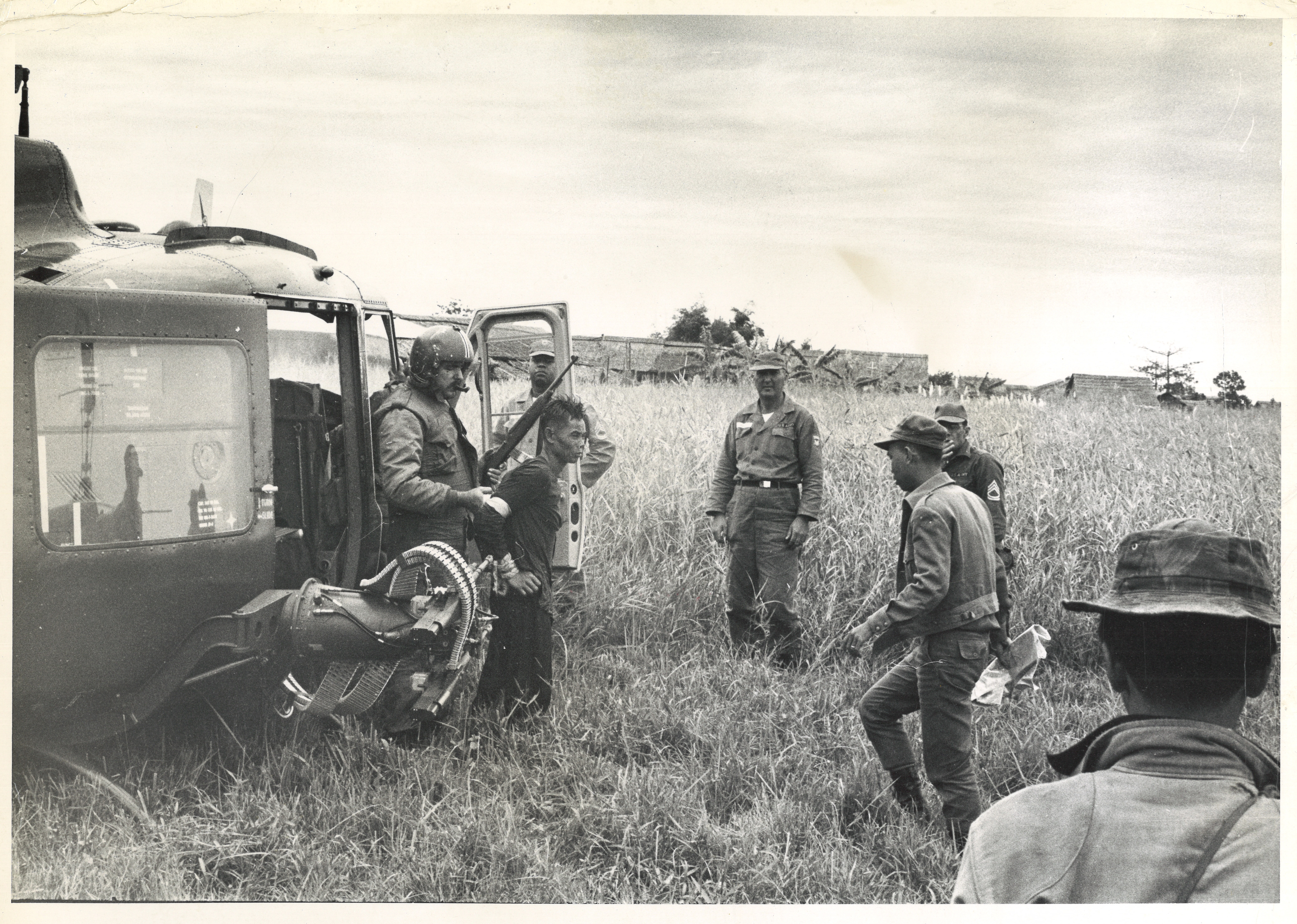 This Viet Cong prisoner has been captured by the South Vietnamese Army (ARVN) south of Saigon. He was transported by a U.S. Army helicopter from the battlefield so that he could be transferred to the South Vietnamese Army for questioning. The captive is shown here with U.S. Army Sergeant Alfred Compton (left) and U.S. Army Specialist Joseph Reed (center) and unnamed members of the ARVN.