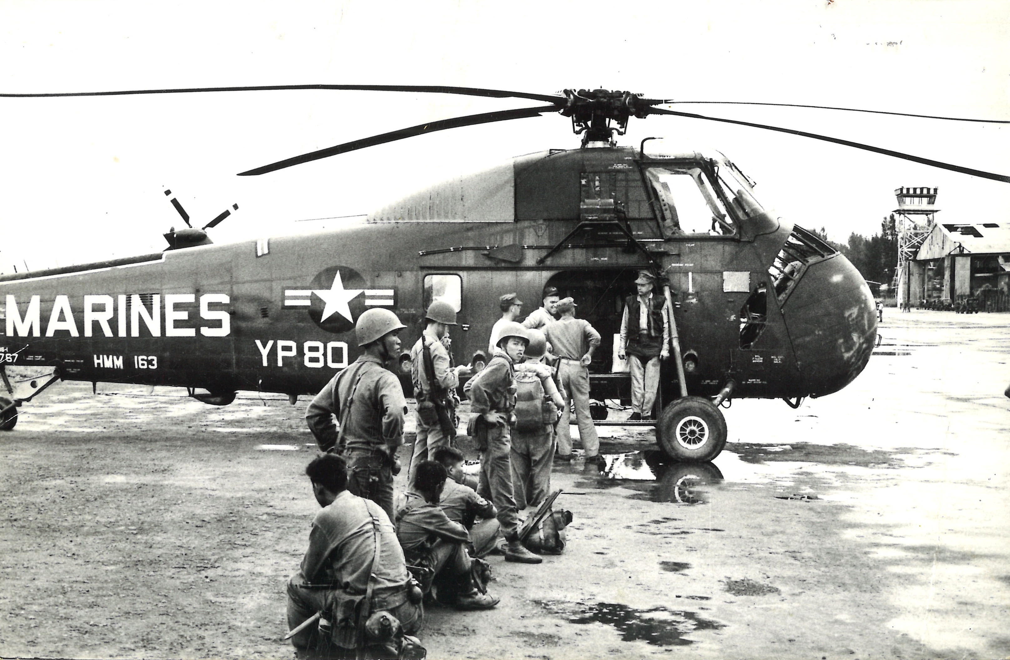 Troops line up beside a Marine helicopter before a mission. To the right in the photo is Captain Frank Allgood, of Fort Scott, Kansas.