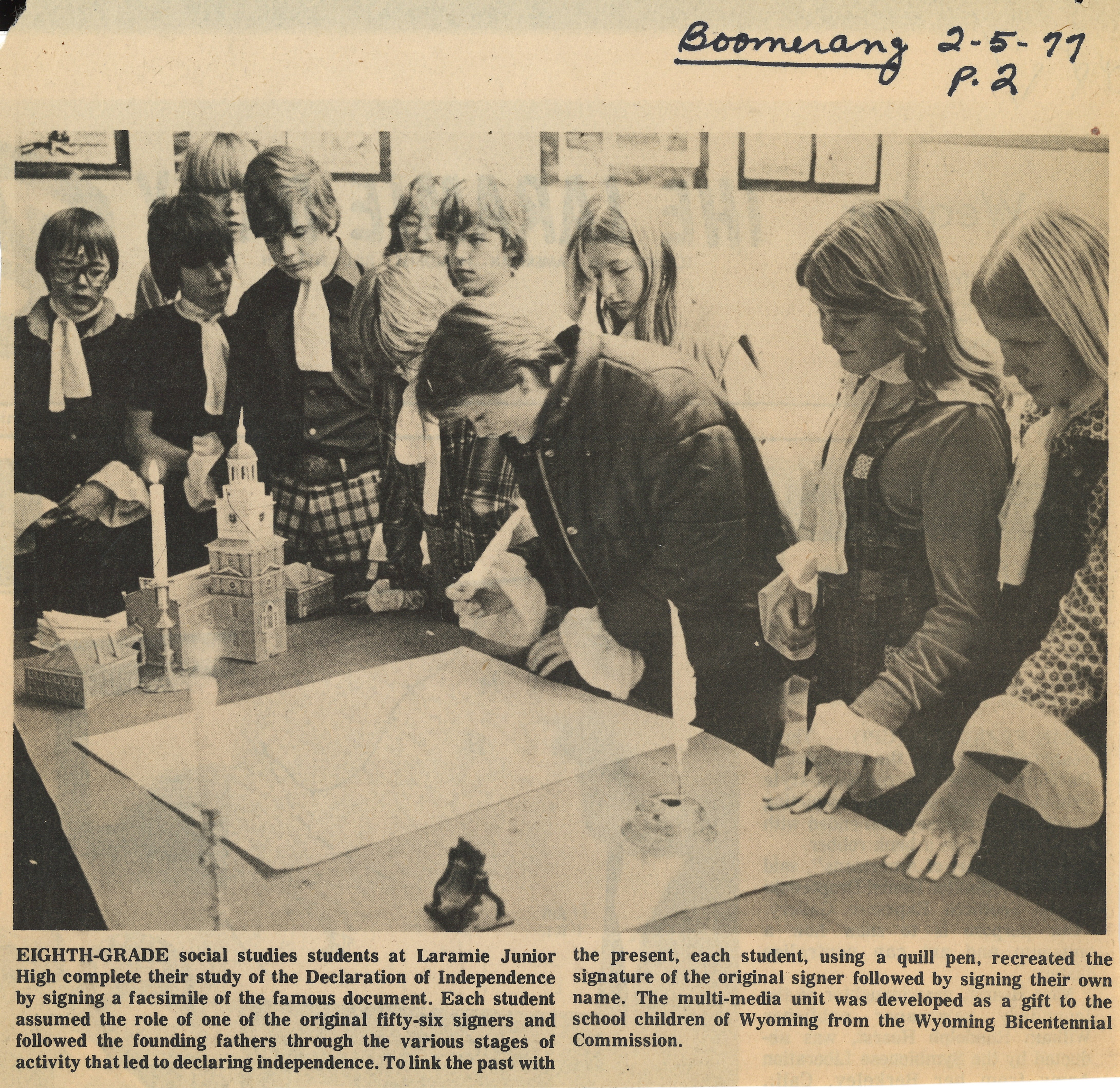 In this photo, eighth-grade students reenact the signing of the Declaration of Independence as part of Bicentennial-related activities in Laramie.