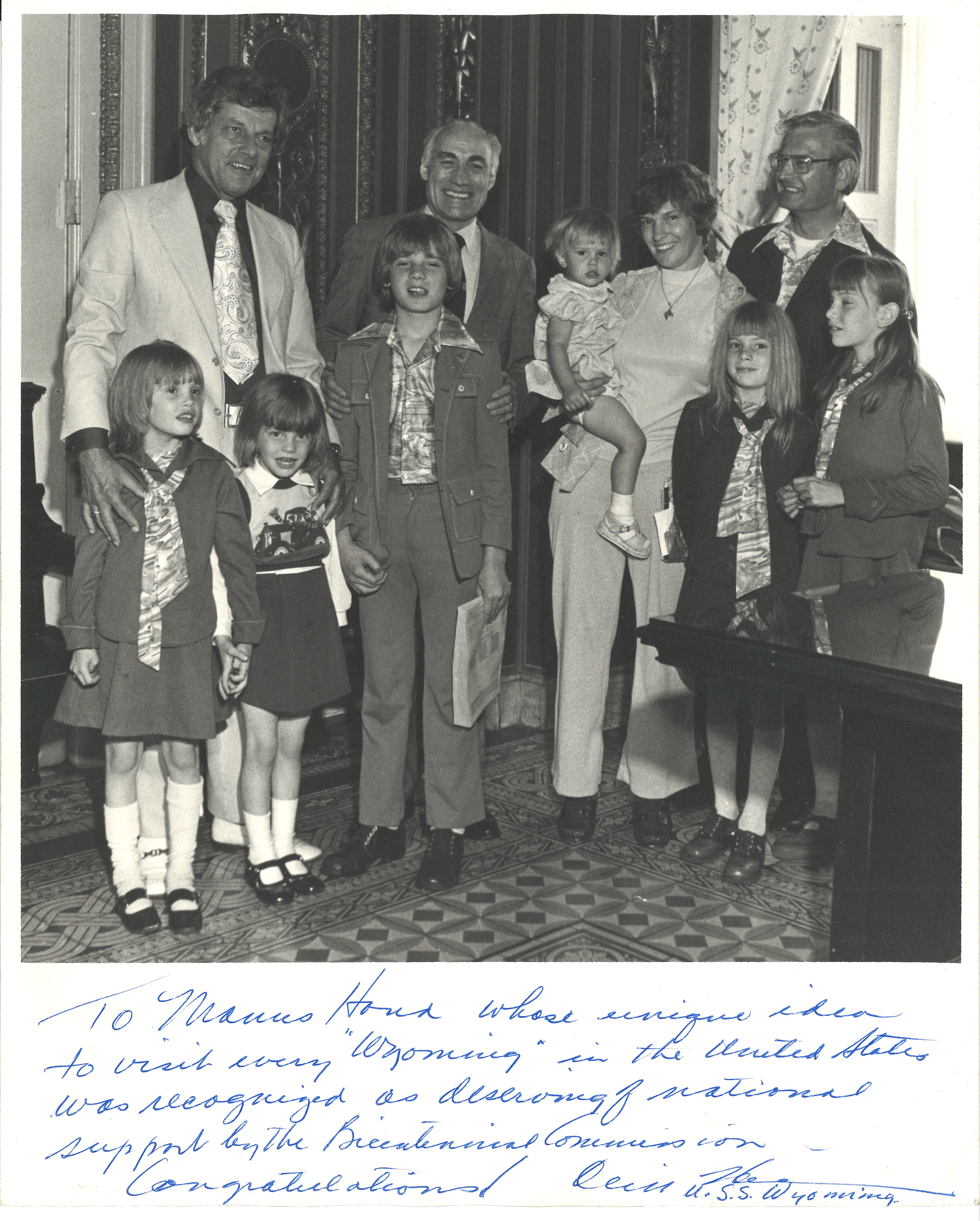 This photograph of Hand and his family was taken with Wyoming Senators Gale McGee and Cliff Hansen when the family visited Washington D.C. as part of their Bicentennial trip.