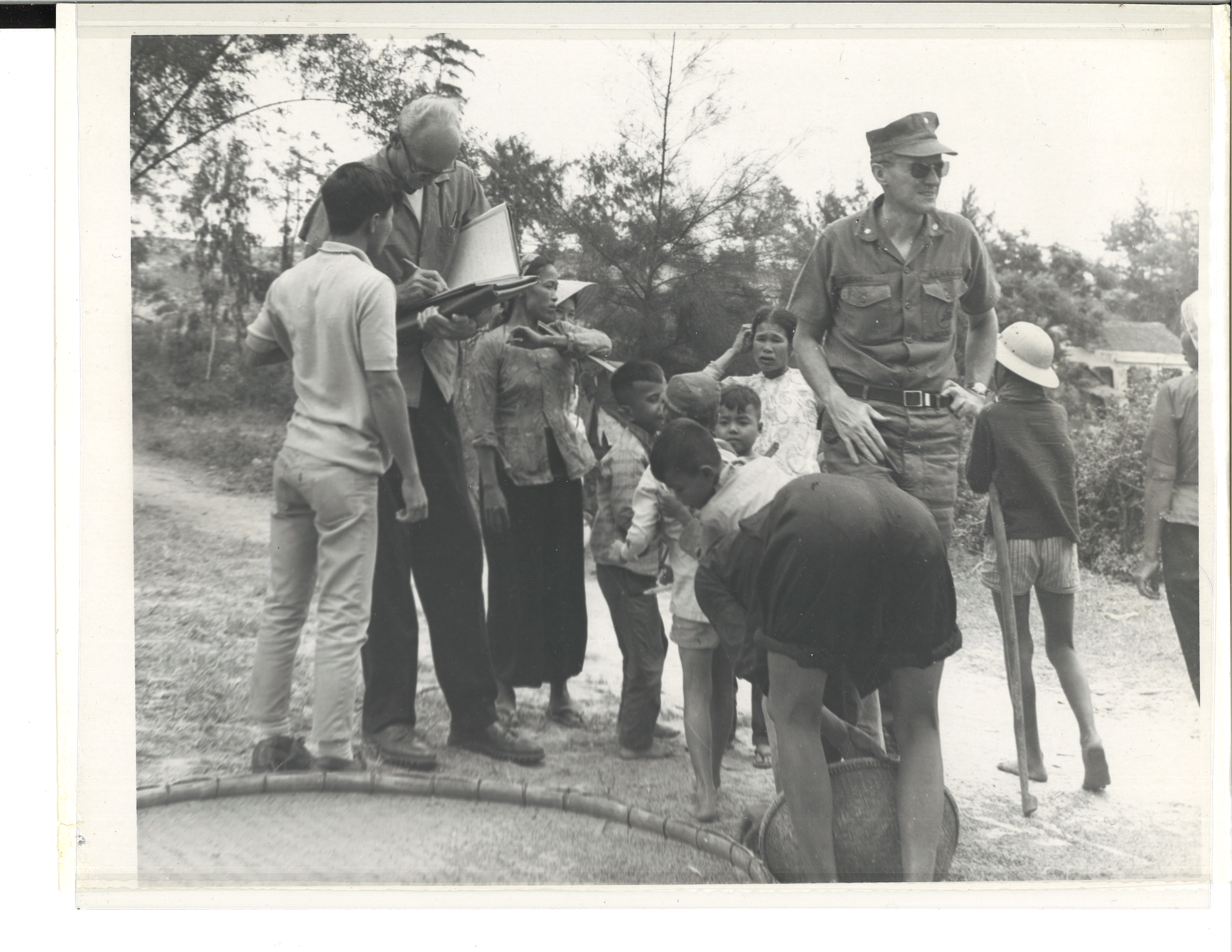 War correspondent Richard Tregaskis takes notes on rice harvesting during a visit to the My Thi village near Da Nang, Vietnam. He is accompanied by U.S. Naval Commander Richard A. Bowers.