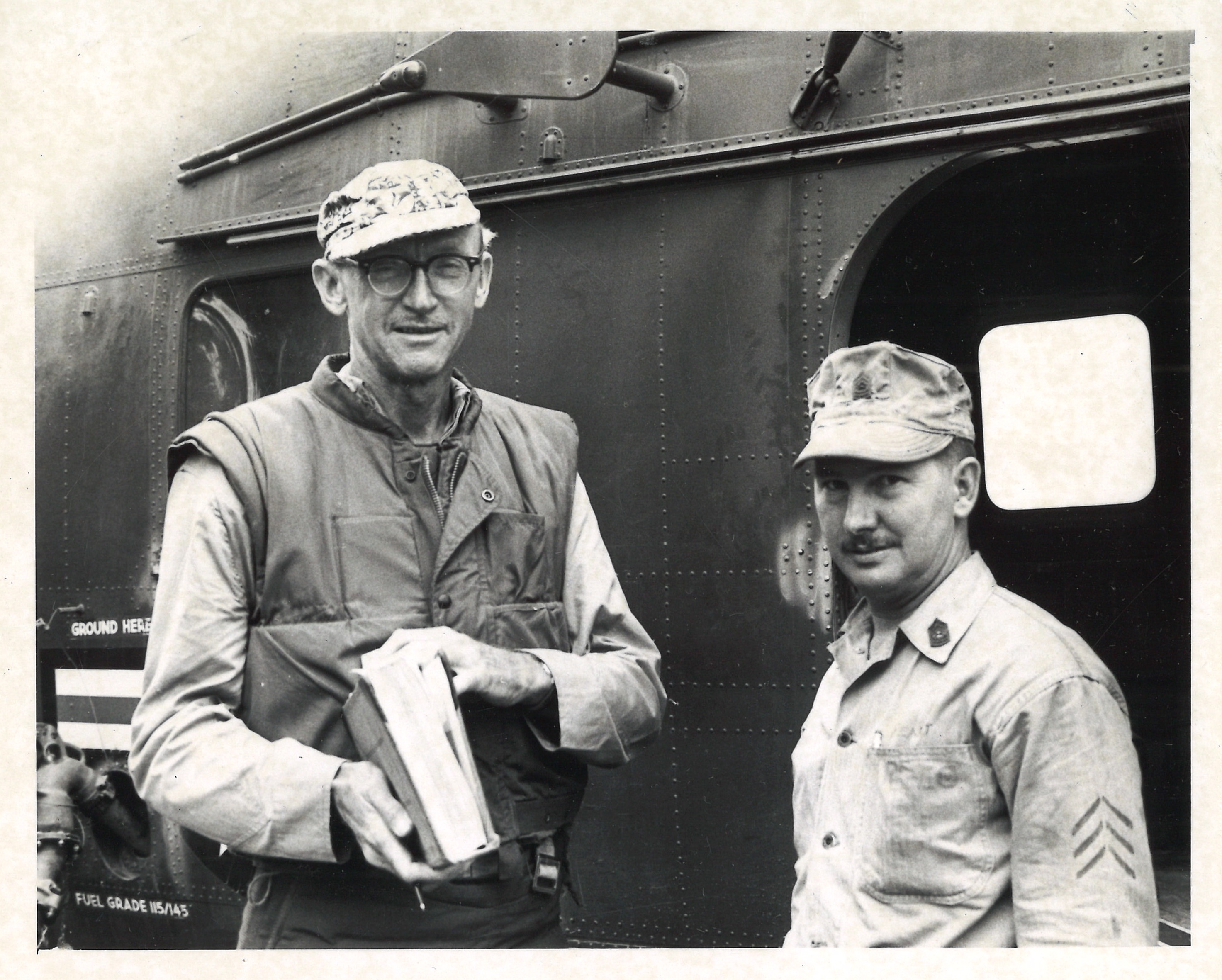 War correspondent Richard Tregaskis stands in front of a U.S. Marine helicopter with Master Sergeant George Peart, who is a gunner and crew chief on assault missions with the Marines.