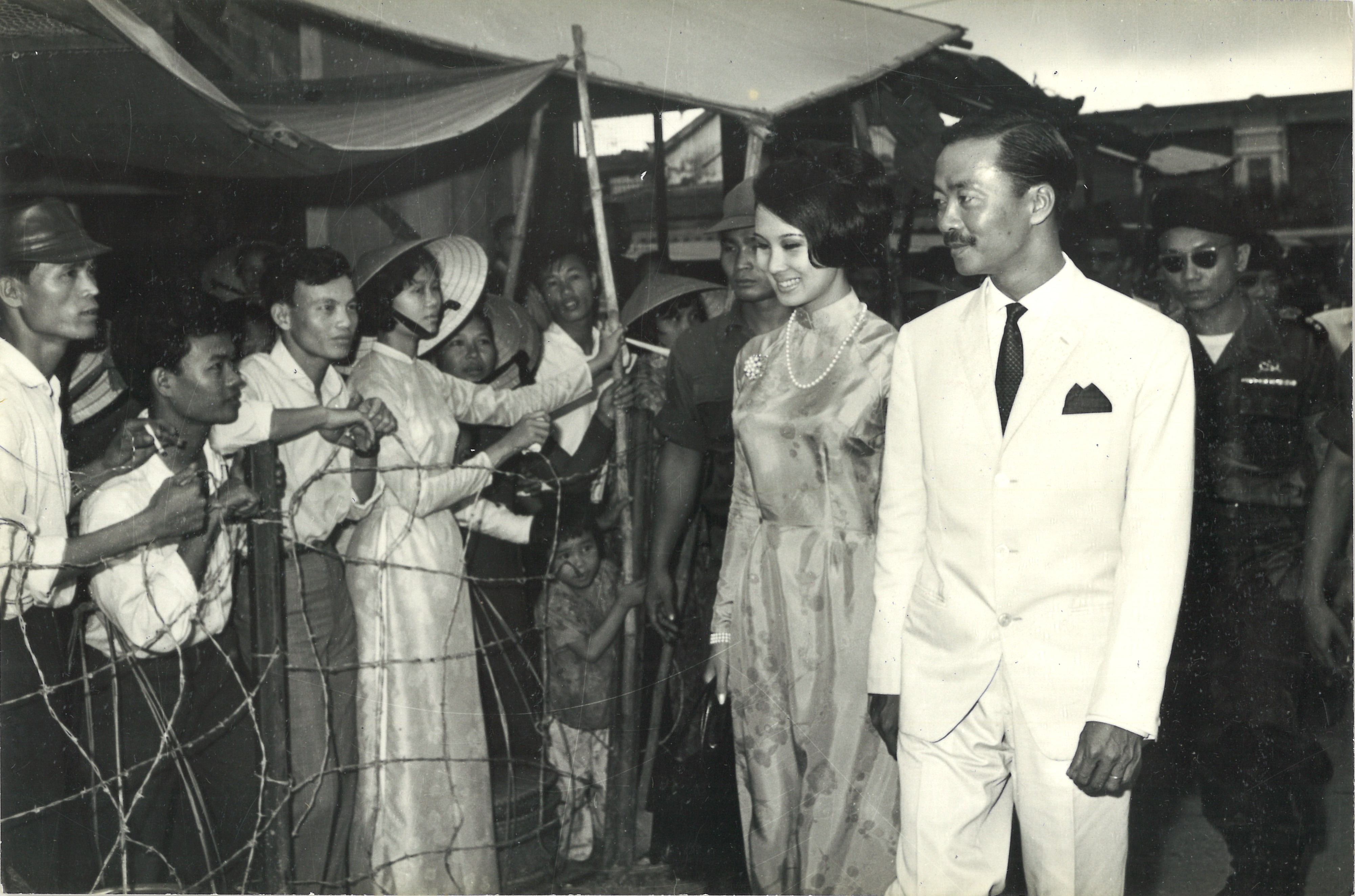 Kỳ and his wife are shown walking in front of a crowd through the Dong Ba Hue Market in South Vietnam.