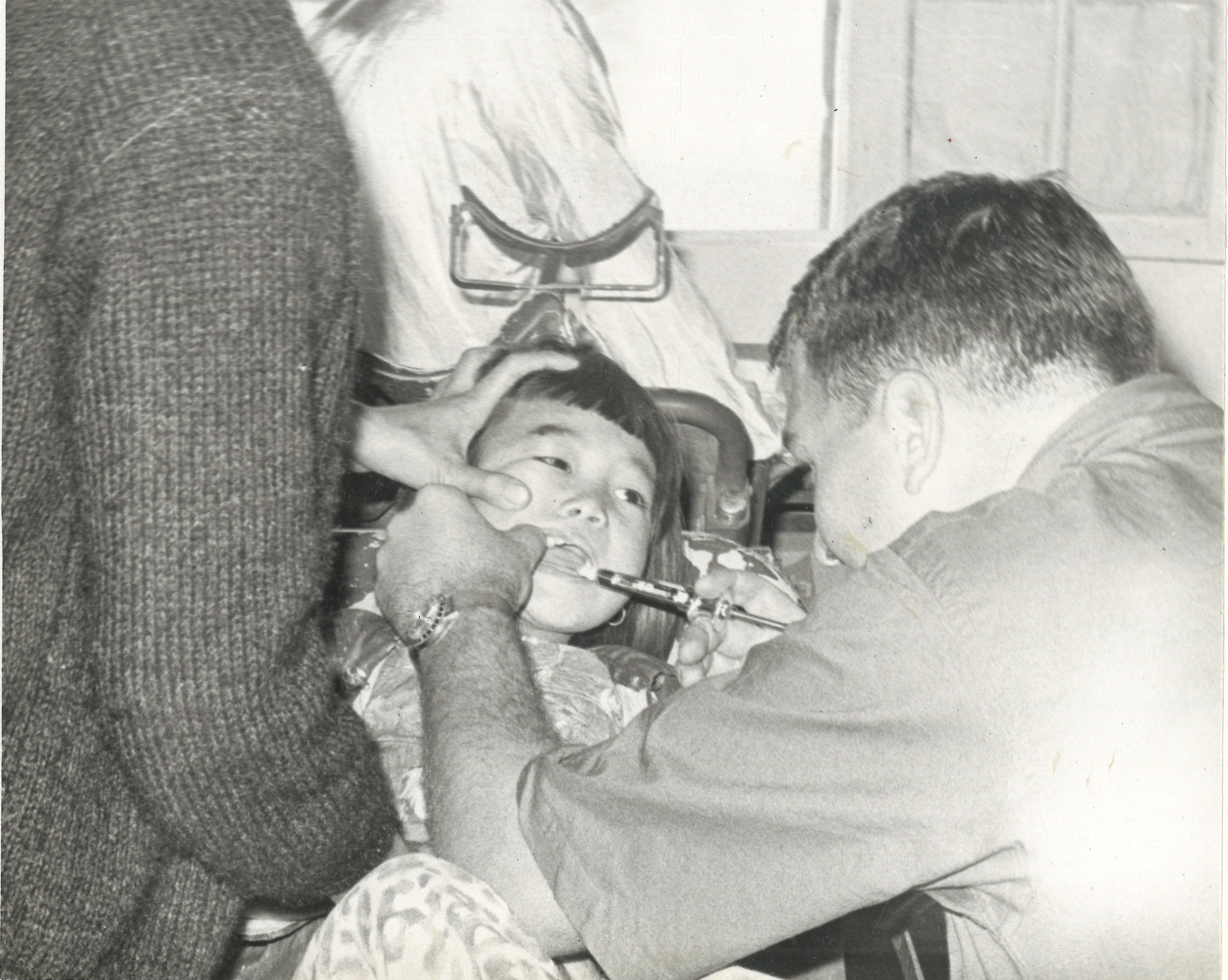 U.S. military dentist Lieutenant D.A. Molloy from Chicago, Illinois, injects novocaine just prior to doing some dental work on a patient at the Sacred Heart Orphanage located in Da Nang East, Vietnam. Tens of thousands of Vietnamese children became orphans over the course of the Vietnam War. Molloy and other U.S. military medical professionals are part of the Medical Civic Action Program (MEDCAP).
