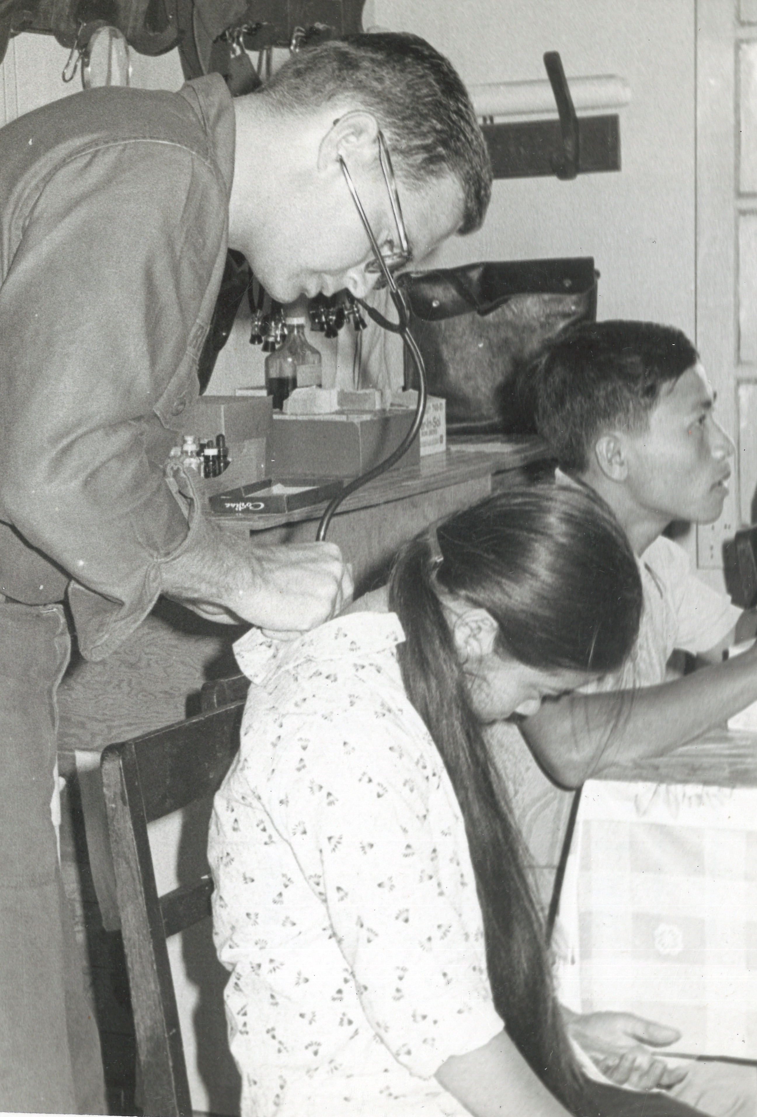 U.S. military Doctor Lieutenant D.J. Rushforth examines a patient during a Medical Civic Action Program (MEDCAP). MEDCAP was run by the U.S. military to provide medical care for Vietnamese civilians with the aim of building goodwill among the South Vietnamese.