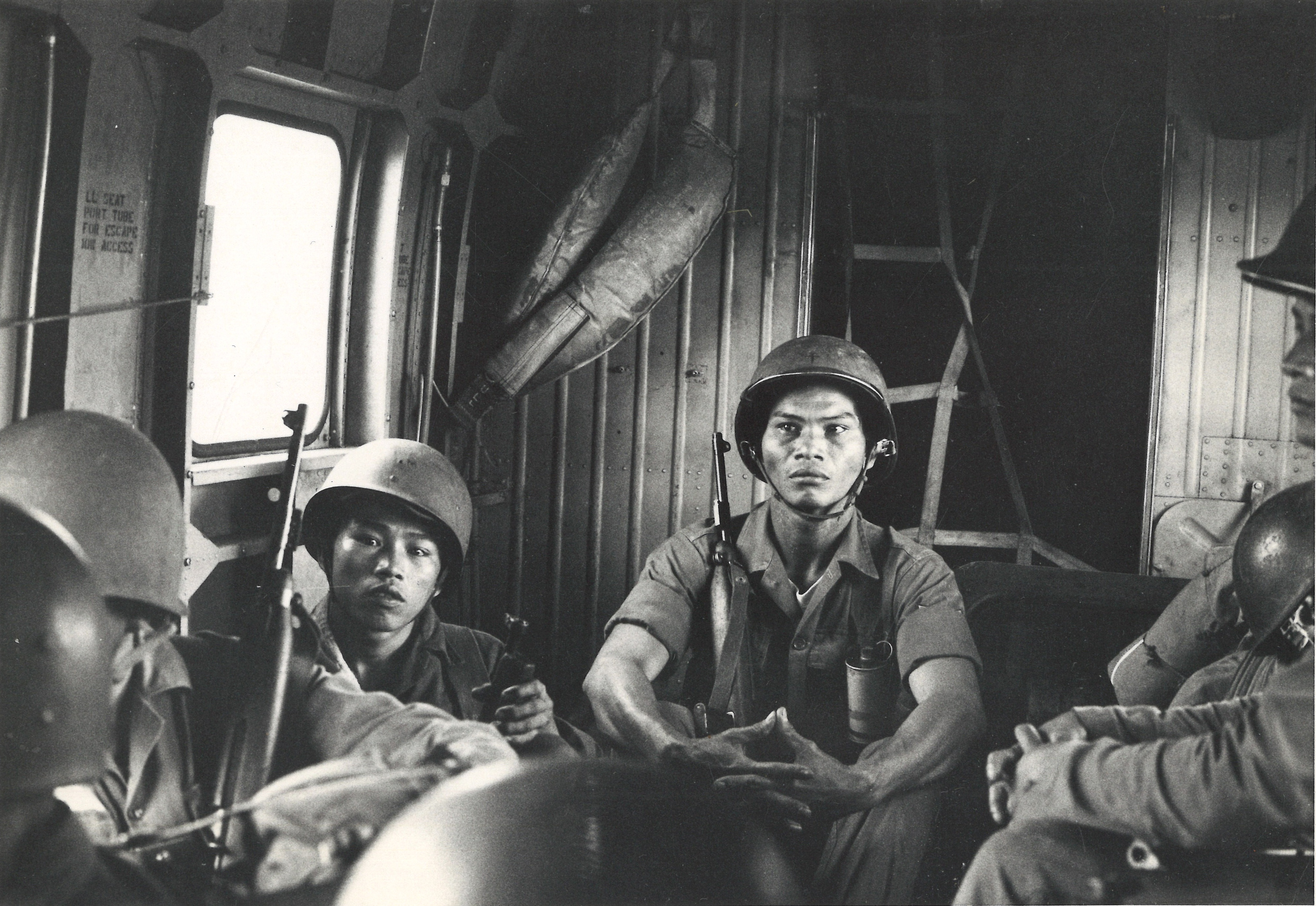 South Vietnamese troops in a U.S. Marine helicopter, heading for an assault into Vietcong territory.