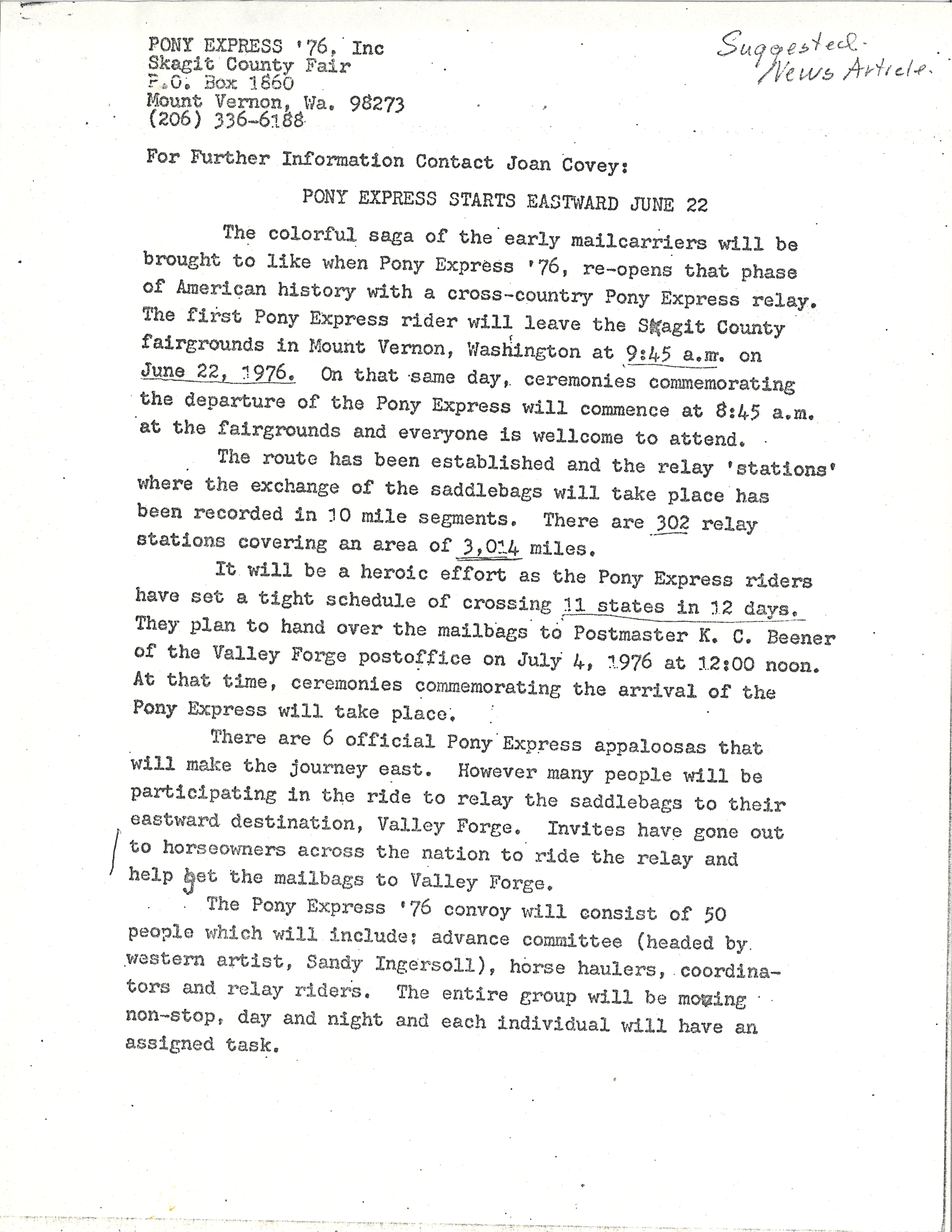 This press release describes the Pony Express re-creation which began June 22, 1976 as part of Bicentennial celebrations.