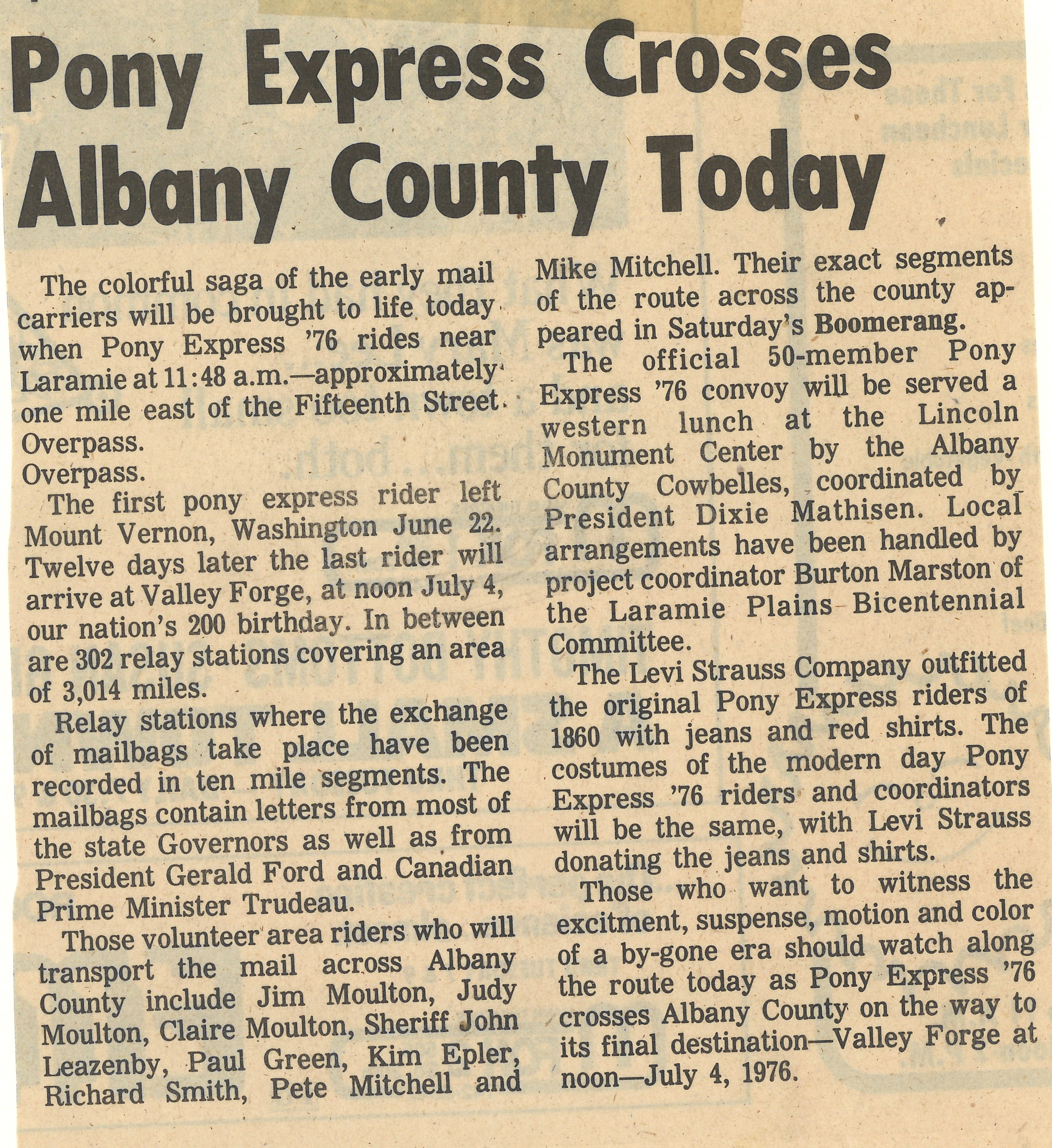 "Pony Express Crosses Albany County Today", Laramie Daily Boomerang, June 27, 1976